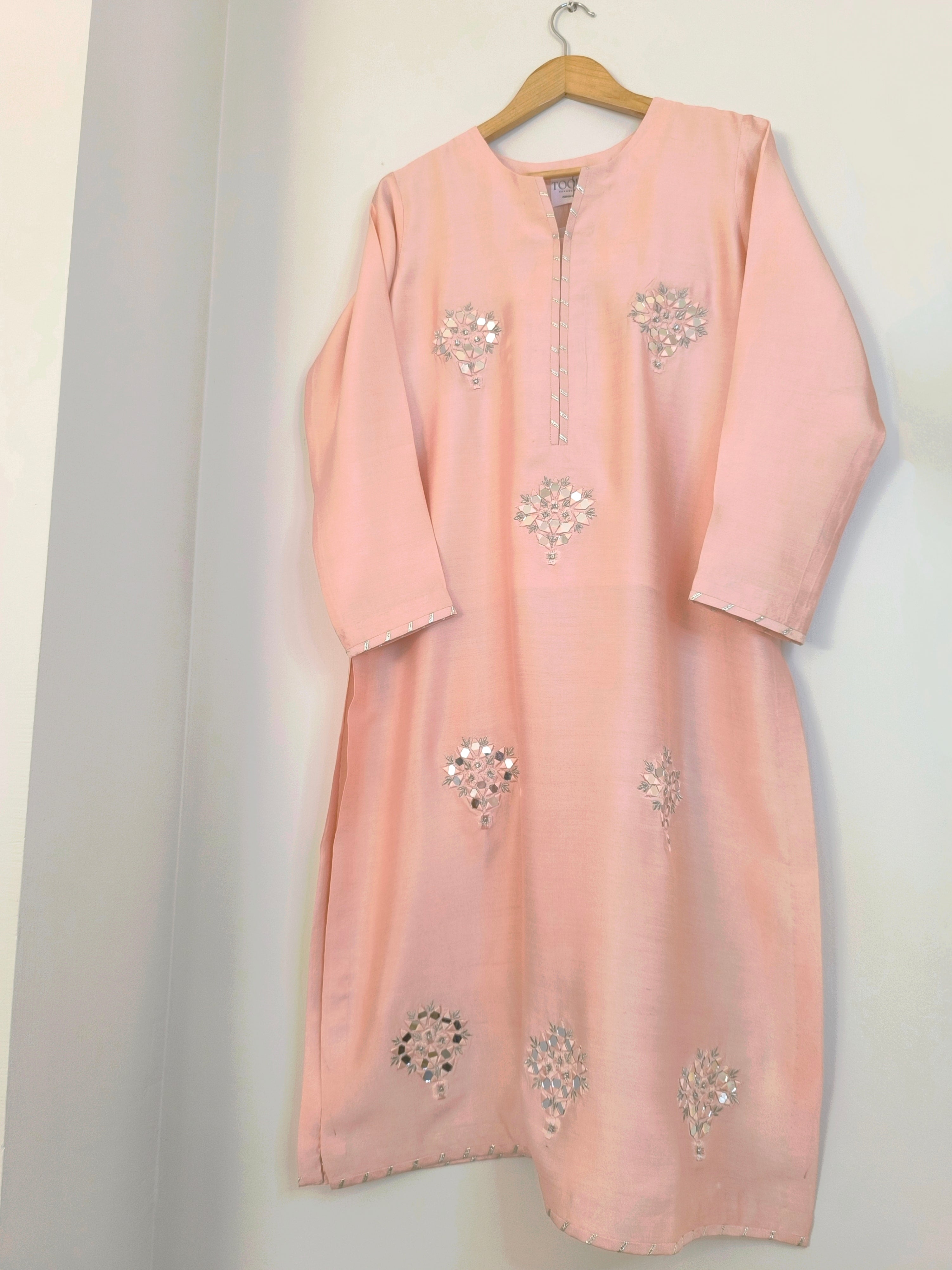 Ayla is a sheesha silk number with meticulous mirror embroidery and dainty hand embellishments for that festive sparkle. The set comes with culotte pants and can be paired with our pure organza dupatta with metallic edging.