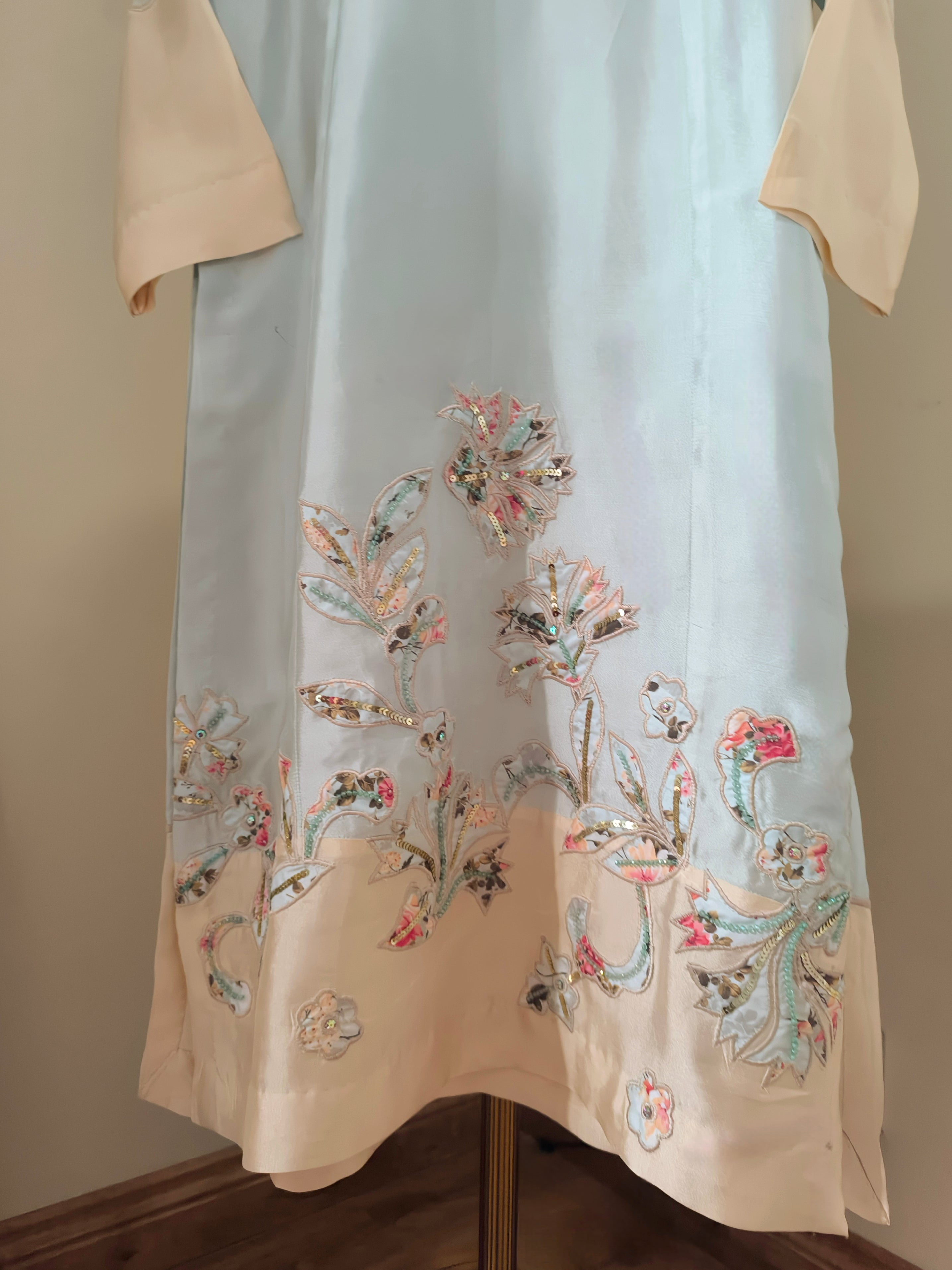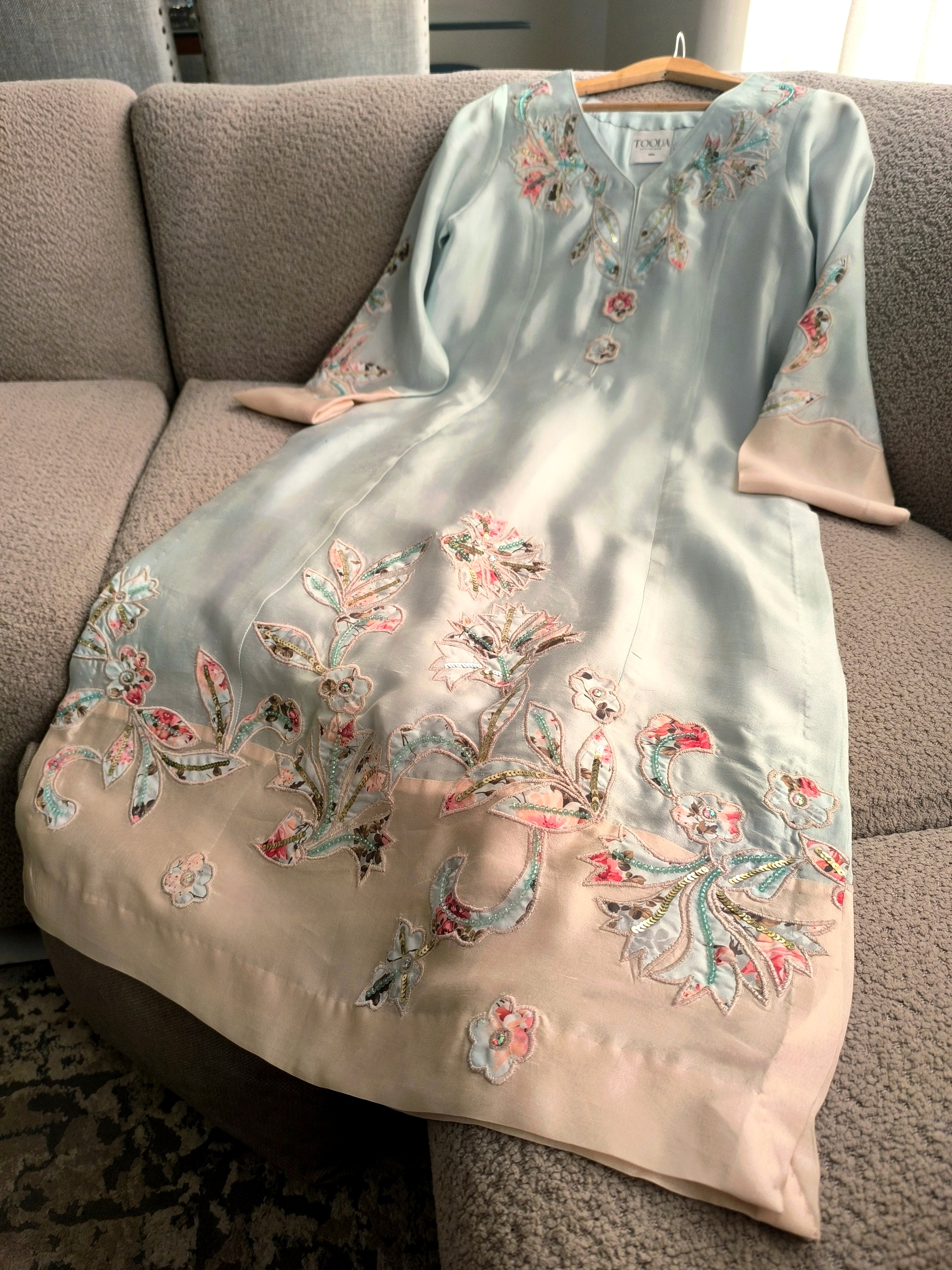 The dupatta is all things dreamy with sequence embellishments and gold-edging. The hanging tassels add weight for easy draping and bring everything harmoniously together.