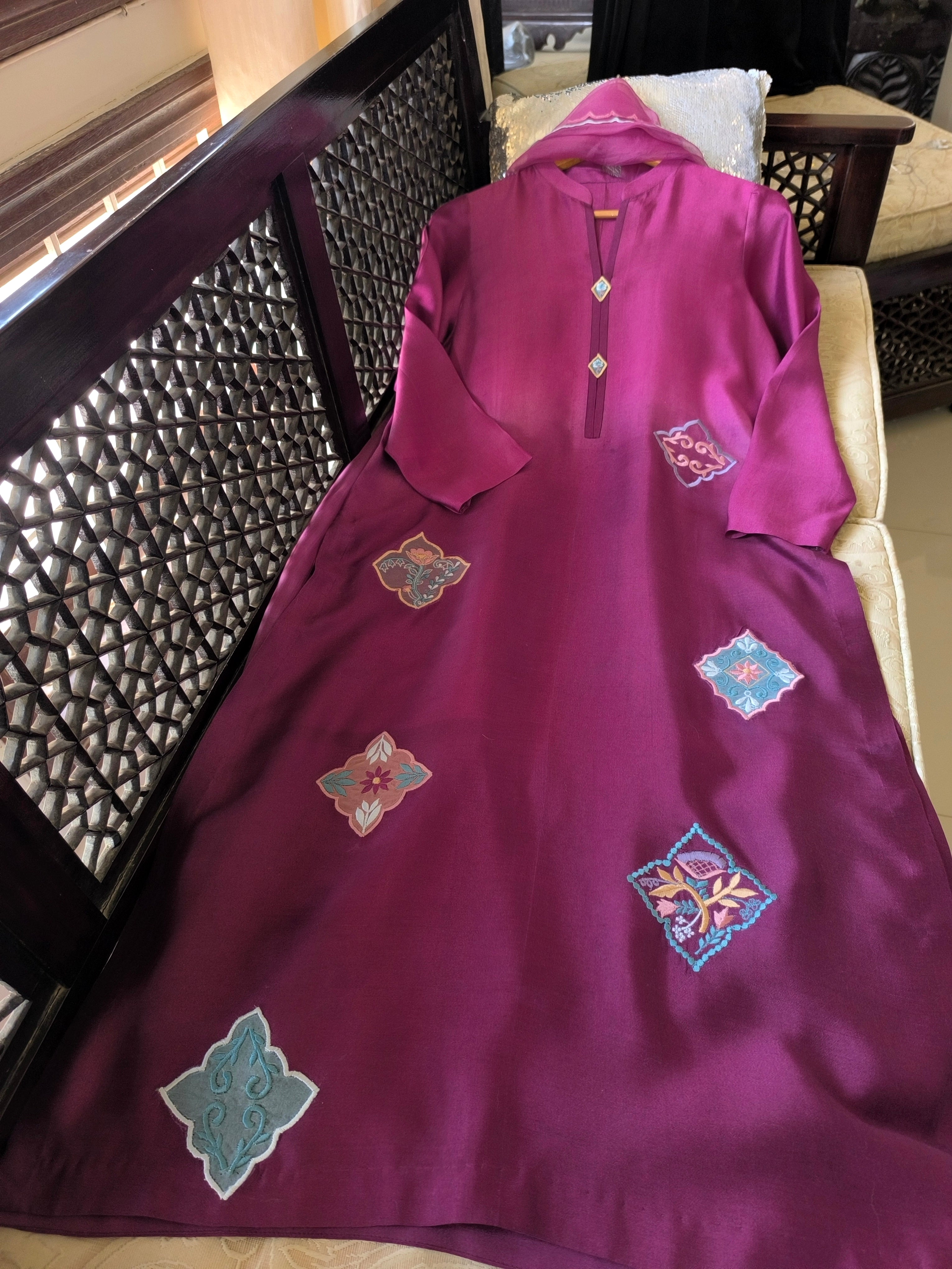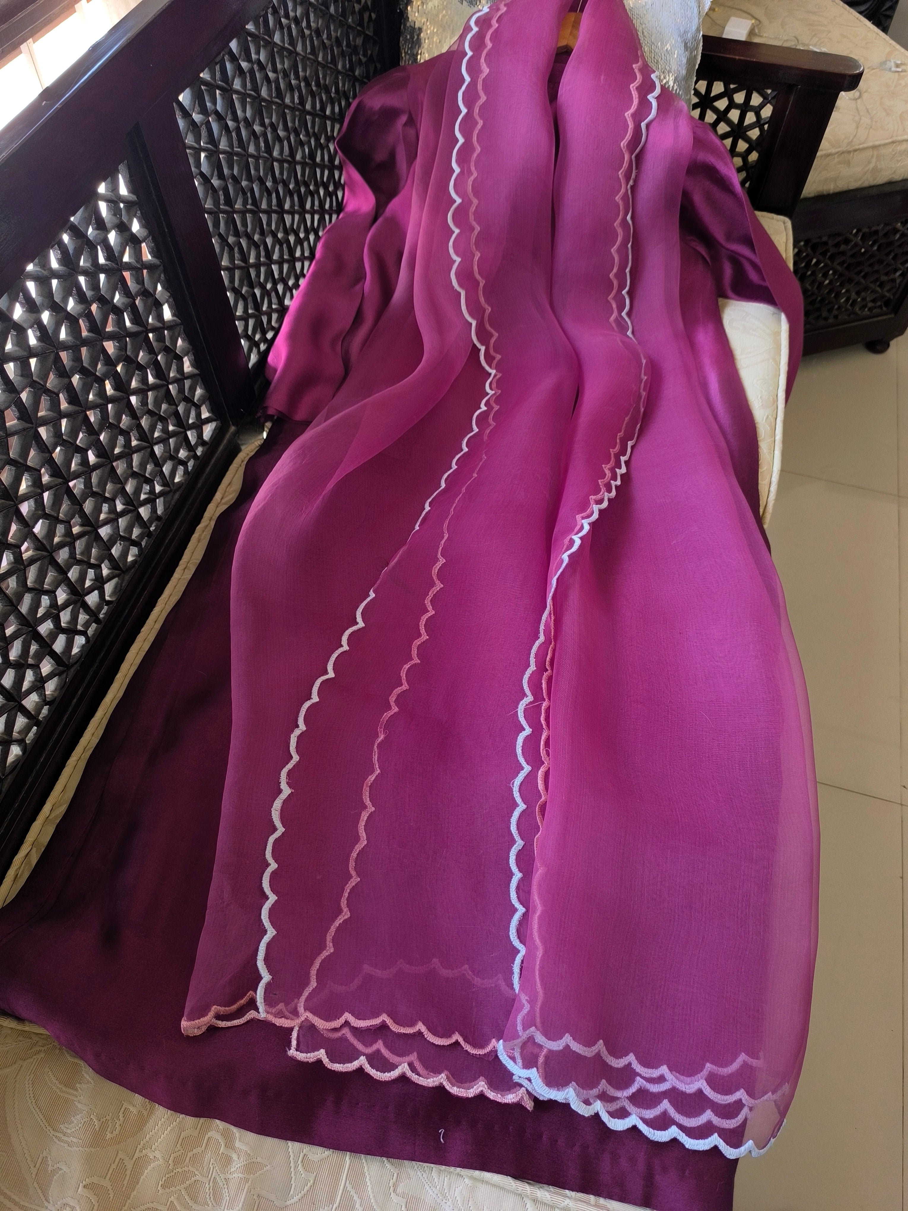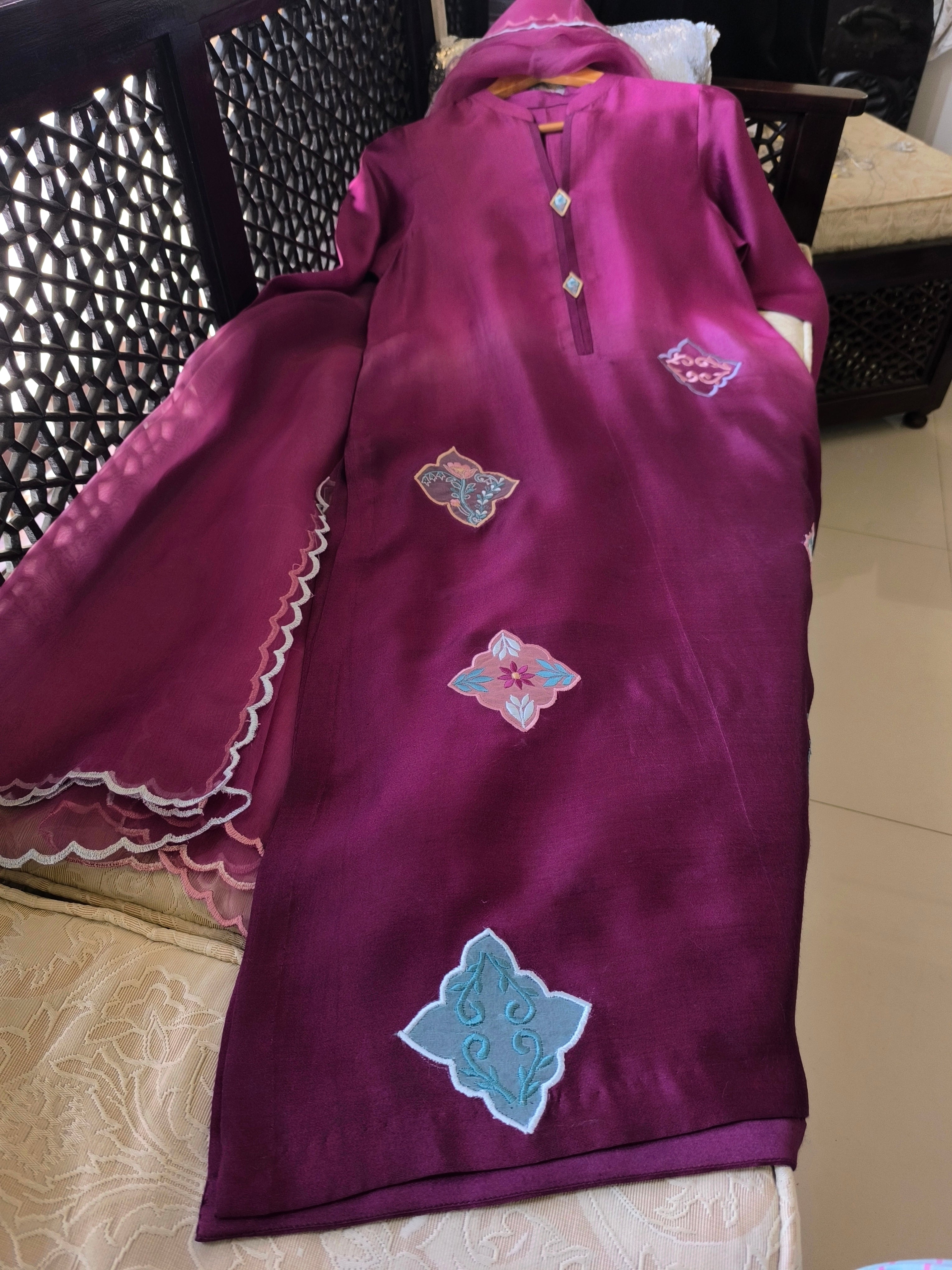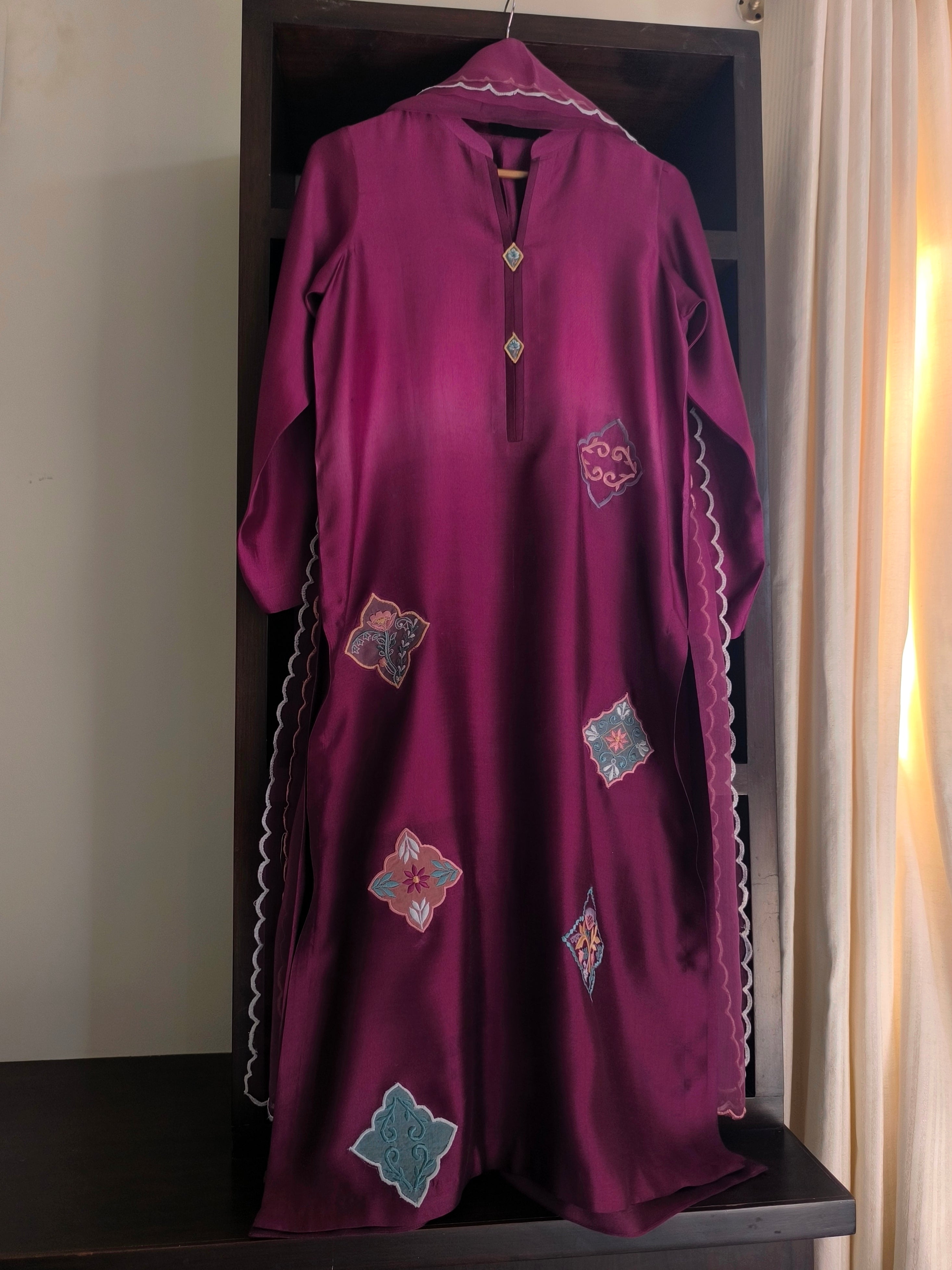 Almaas is an ombré berry shirt-and-pants set, accented with statement embroidery in playful hues. While the silhouette remains classic, the ensemble is reimagined with a contemporary sensibility, making it a versatile choice for a wide range of occasions.