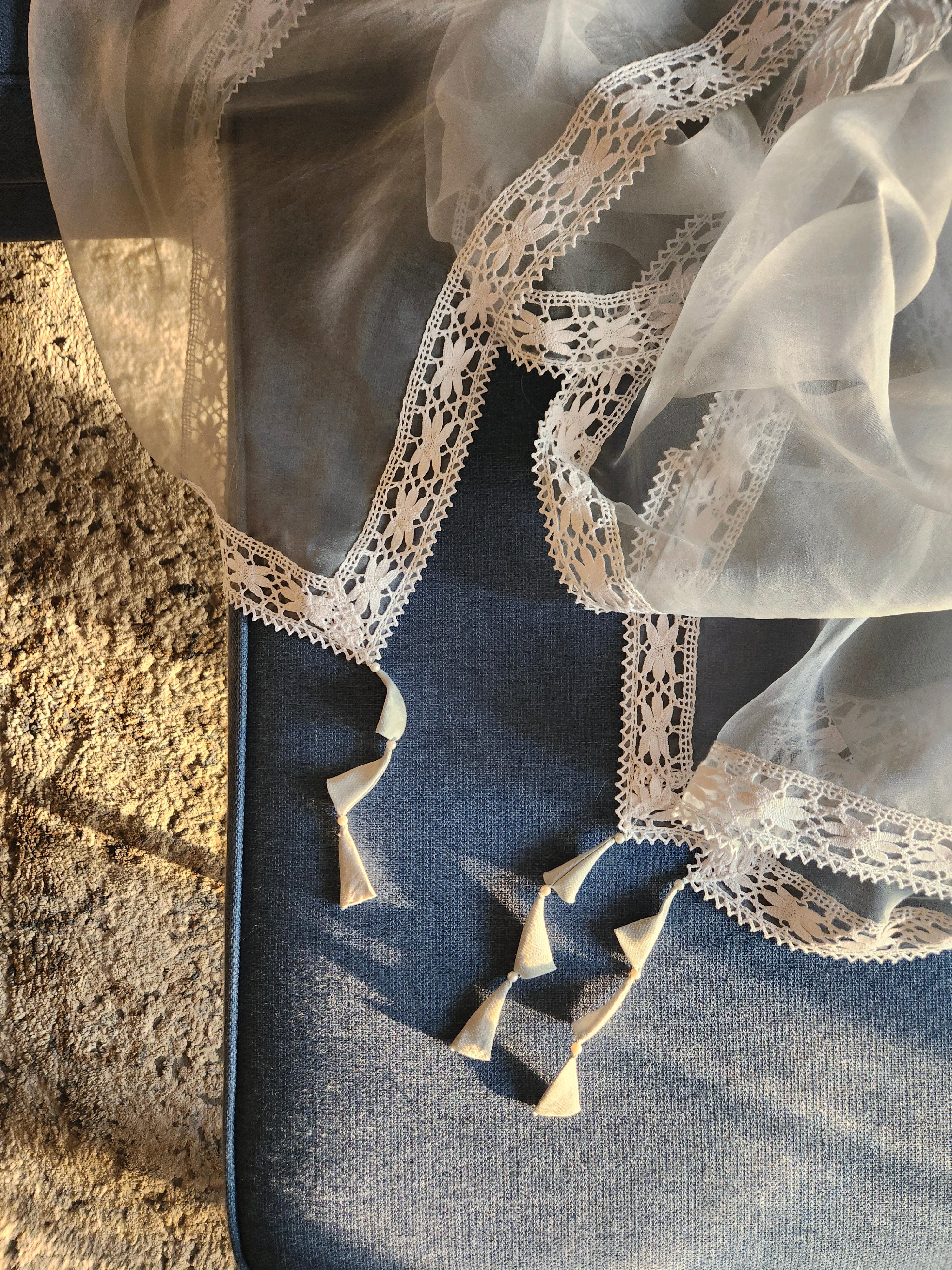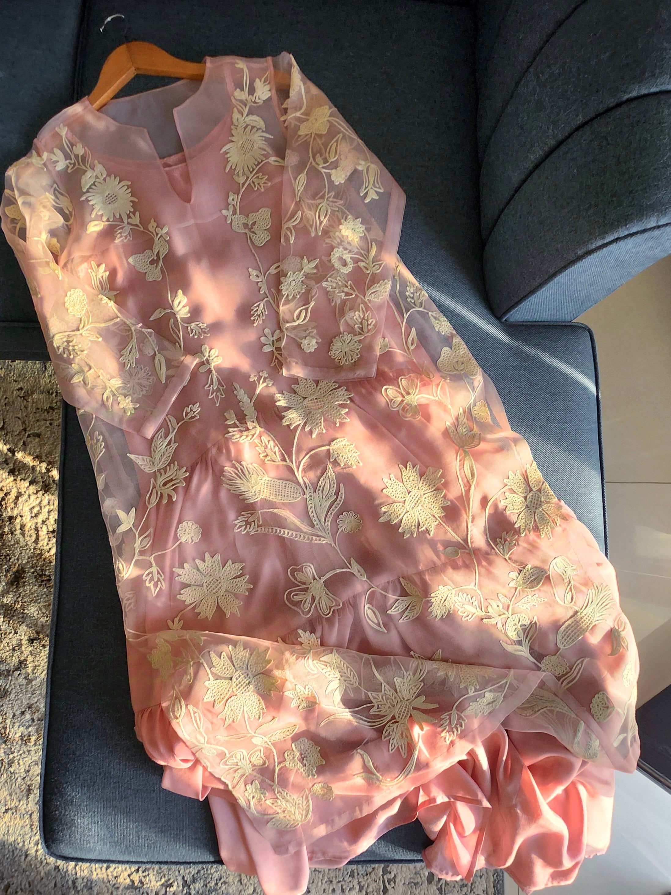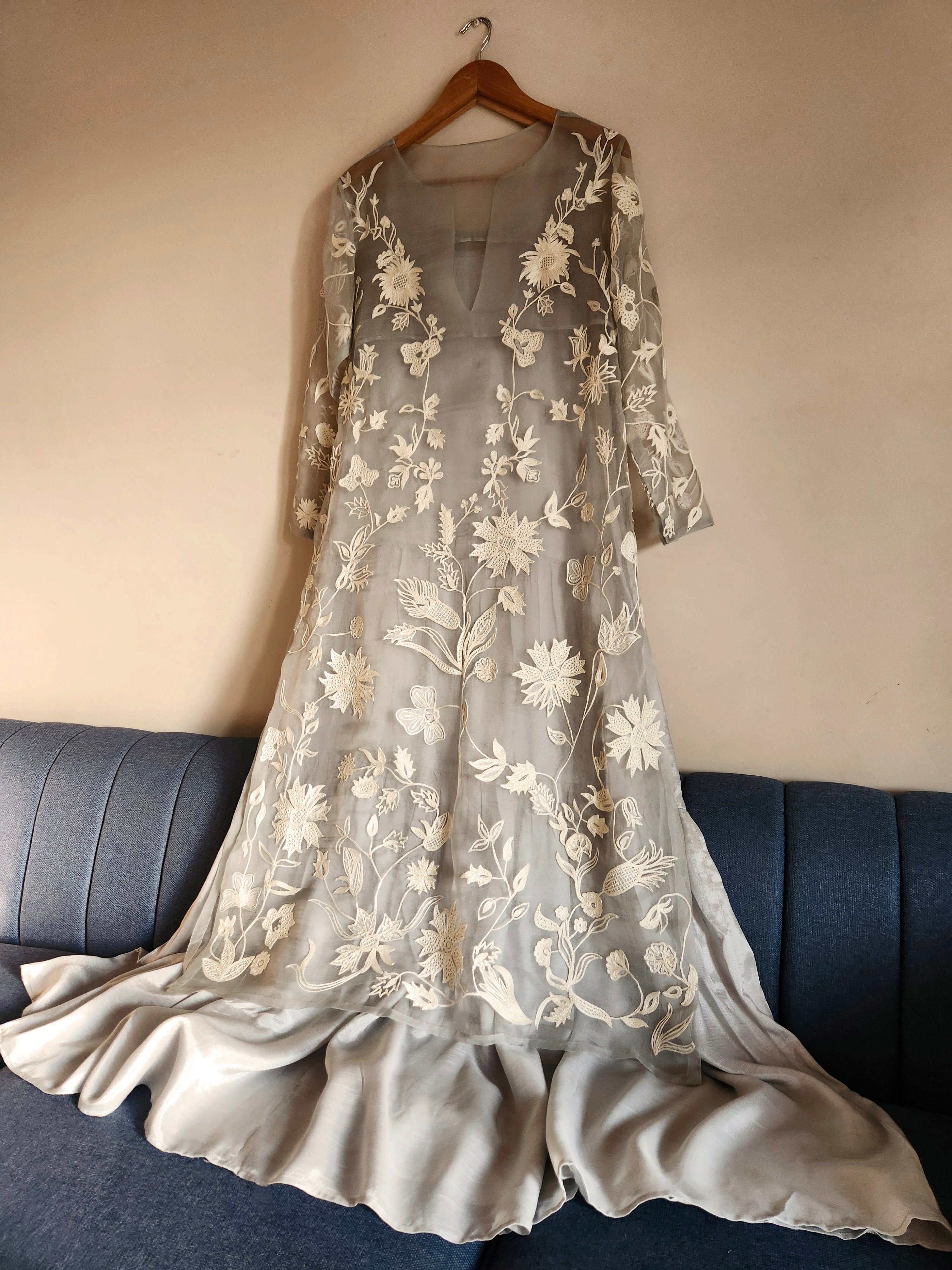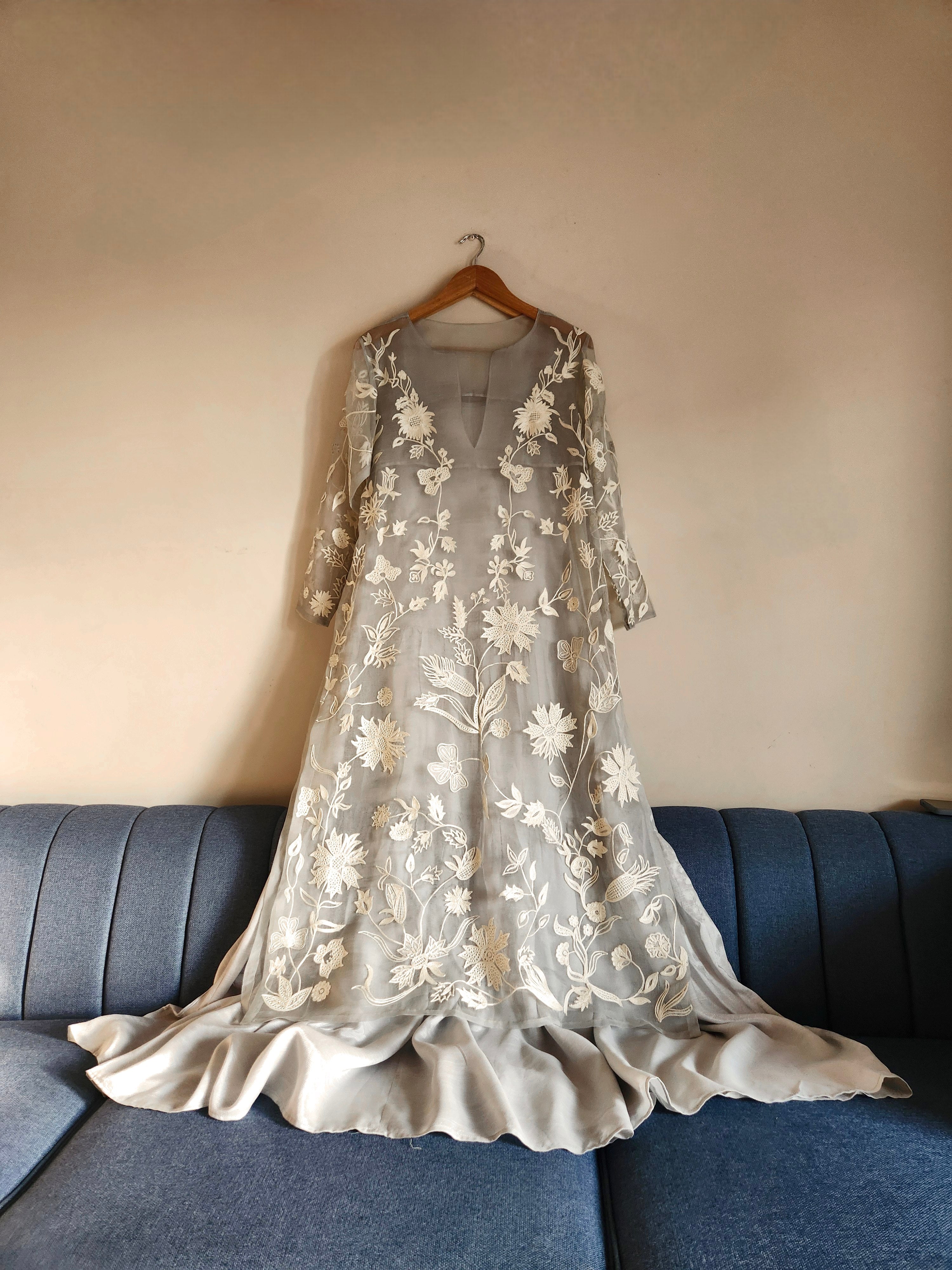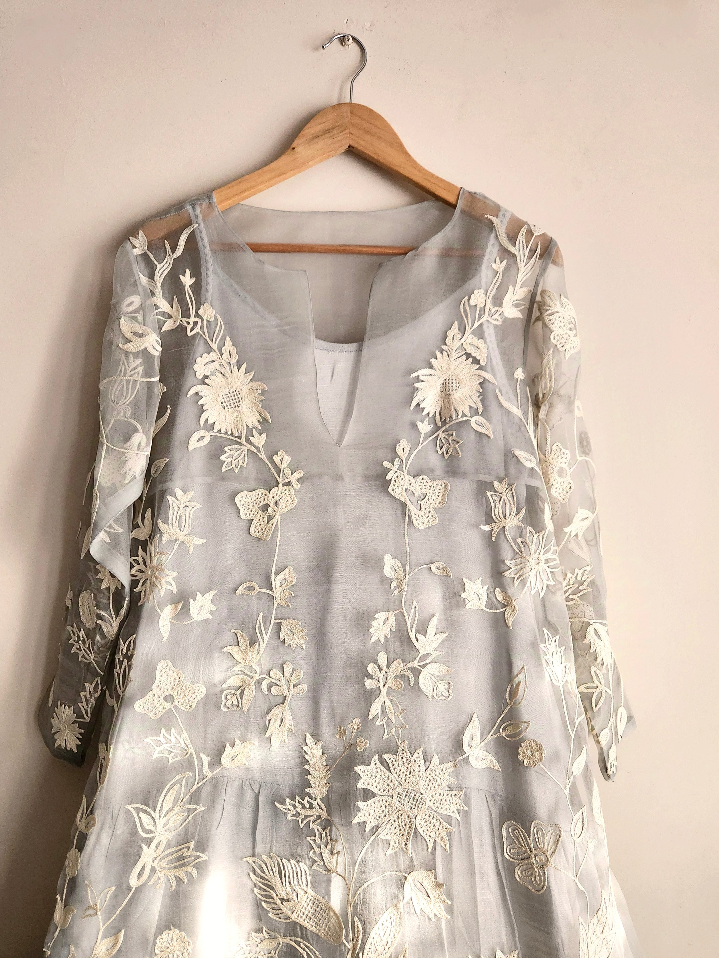Dove is a true masterpiece crafted on organza, featuring a cotton silk tiered lining that adds volume and a regal, princess-like charm to this exquisite outfit. The shirt is adorned with intricate Ari embroidery of flora and fauna, making it a statement of timeless elegance. Pair it with our lace organza dupatta for the perfect finishing touch.