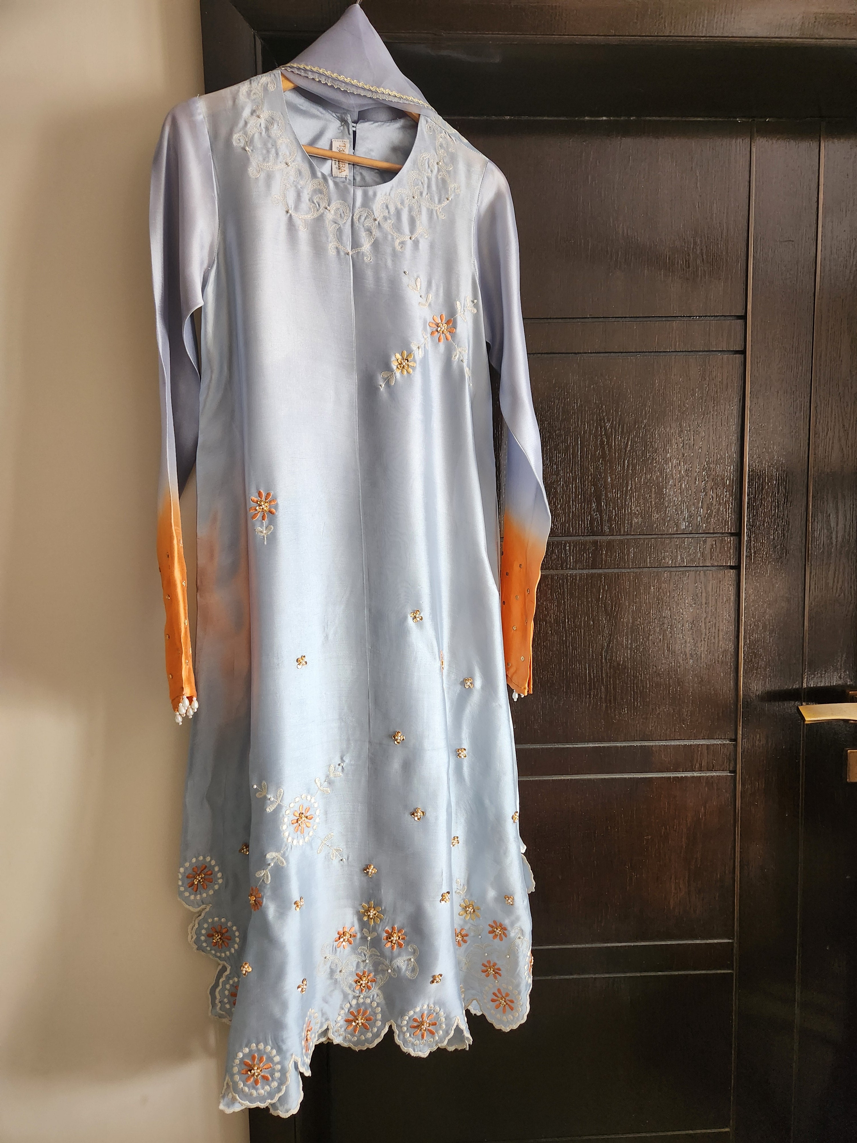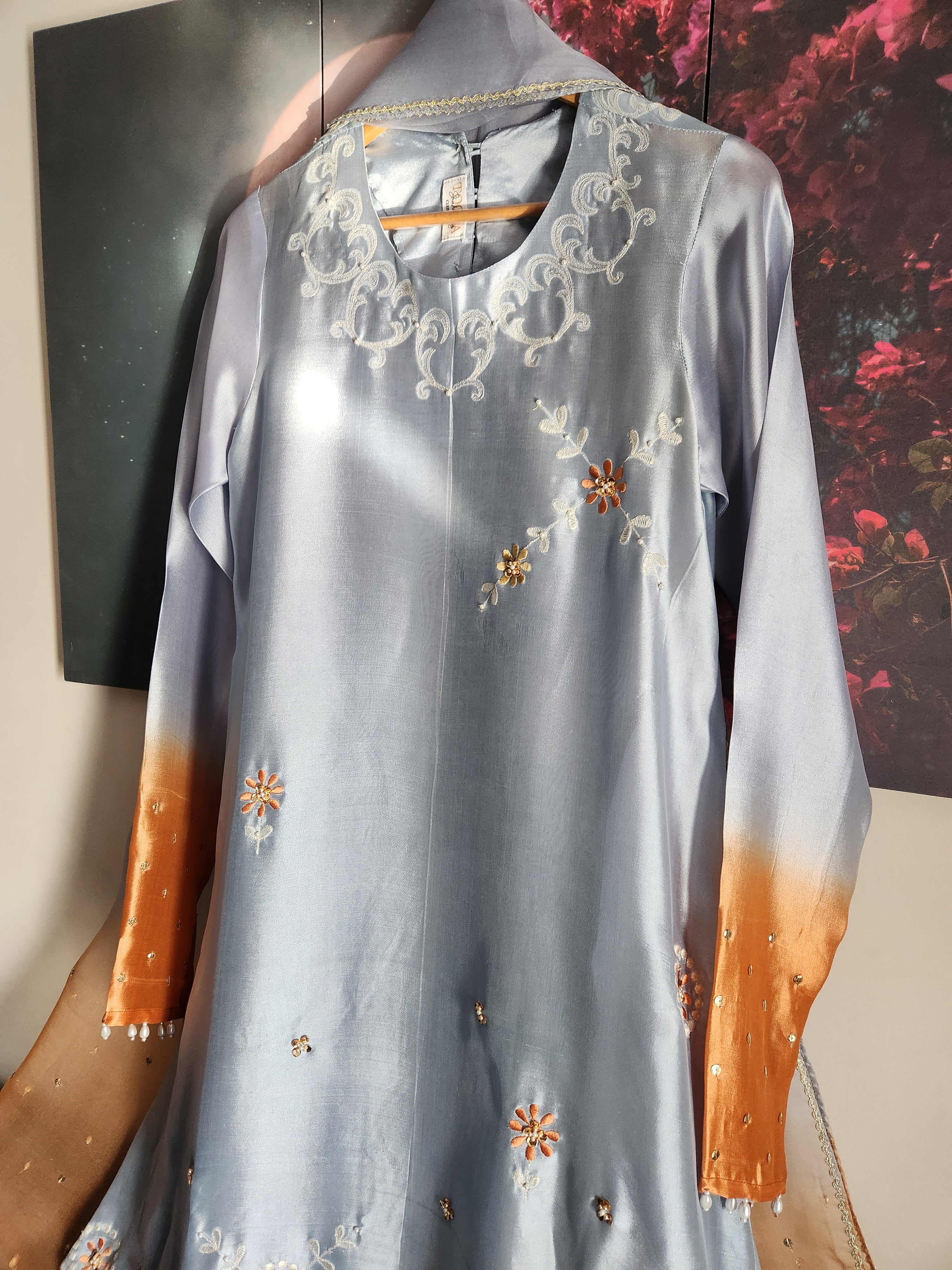 Fara is a two piece tissue-silk set in the color of washed denim. The silhouette is a foundational TS favorite since 2002. The front boasts of elaborate embroidery and cutwork topped with pearl and sequence embellishments. Paired with cigarette pants with pearl embellishments, it's laid-back, comfortable but massively elevated. Style it with our ombre embellished dupatta.