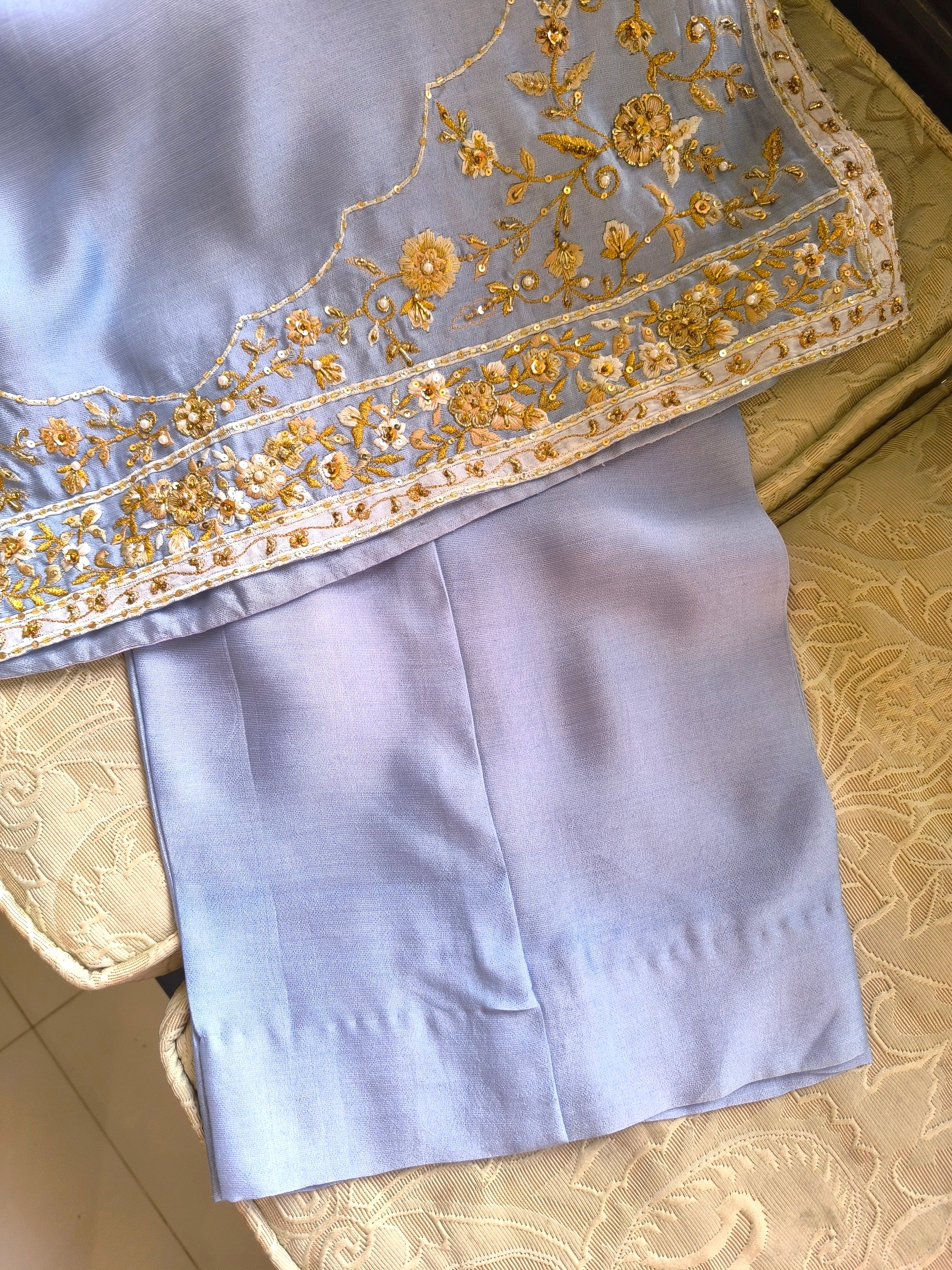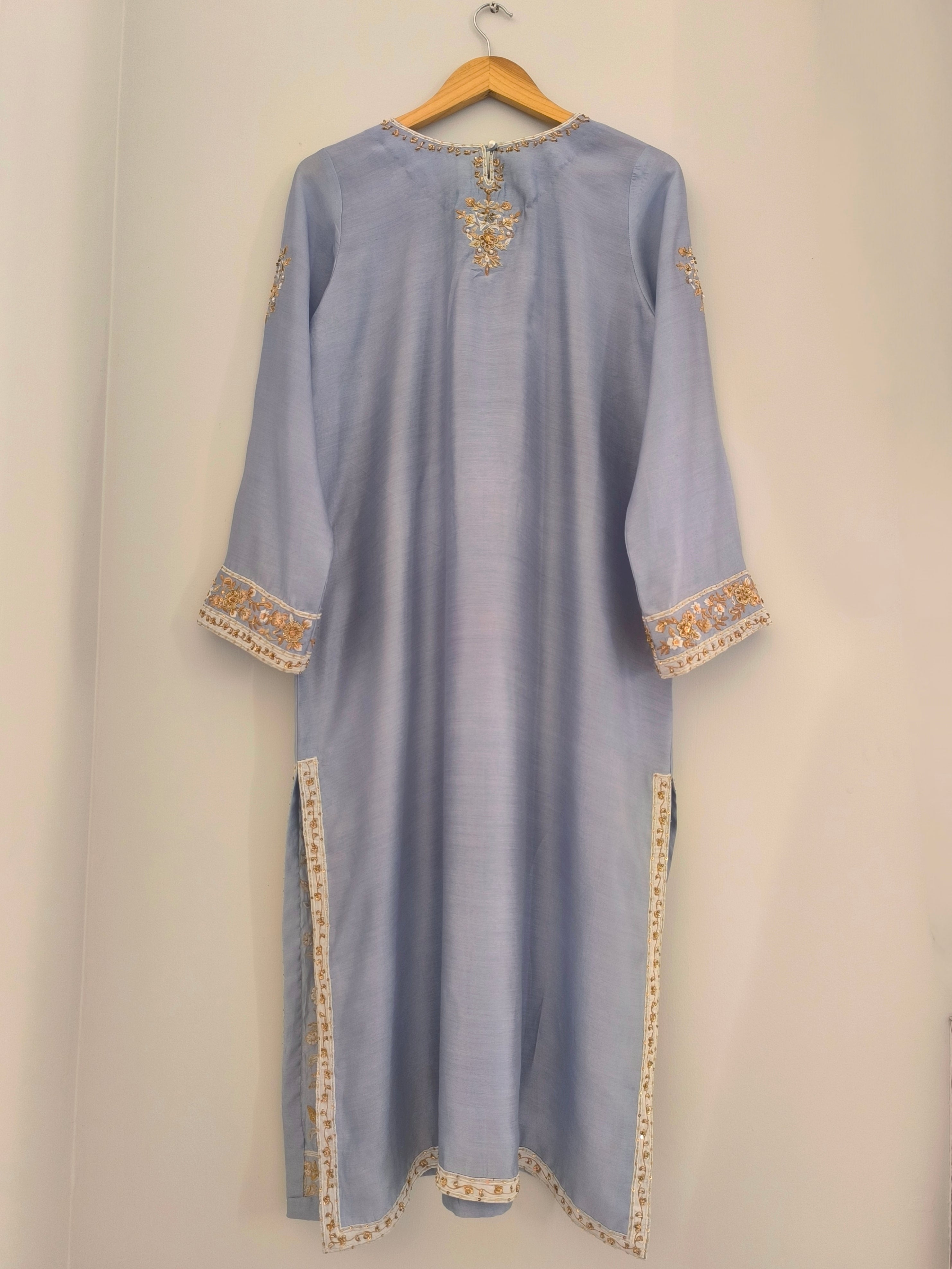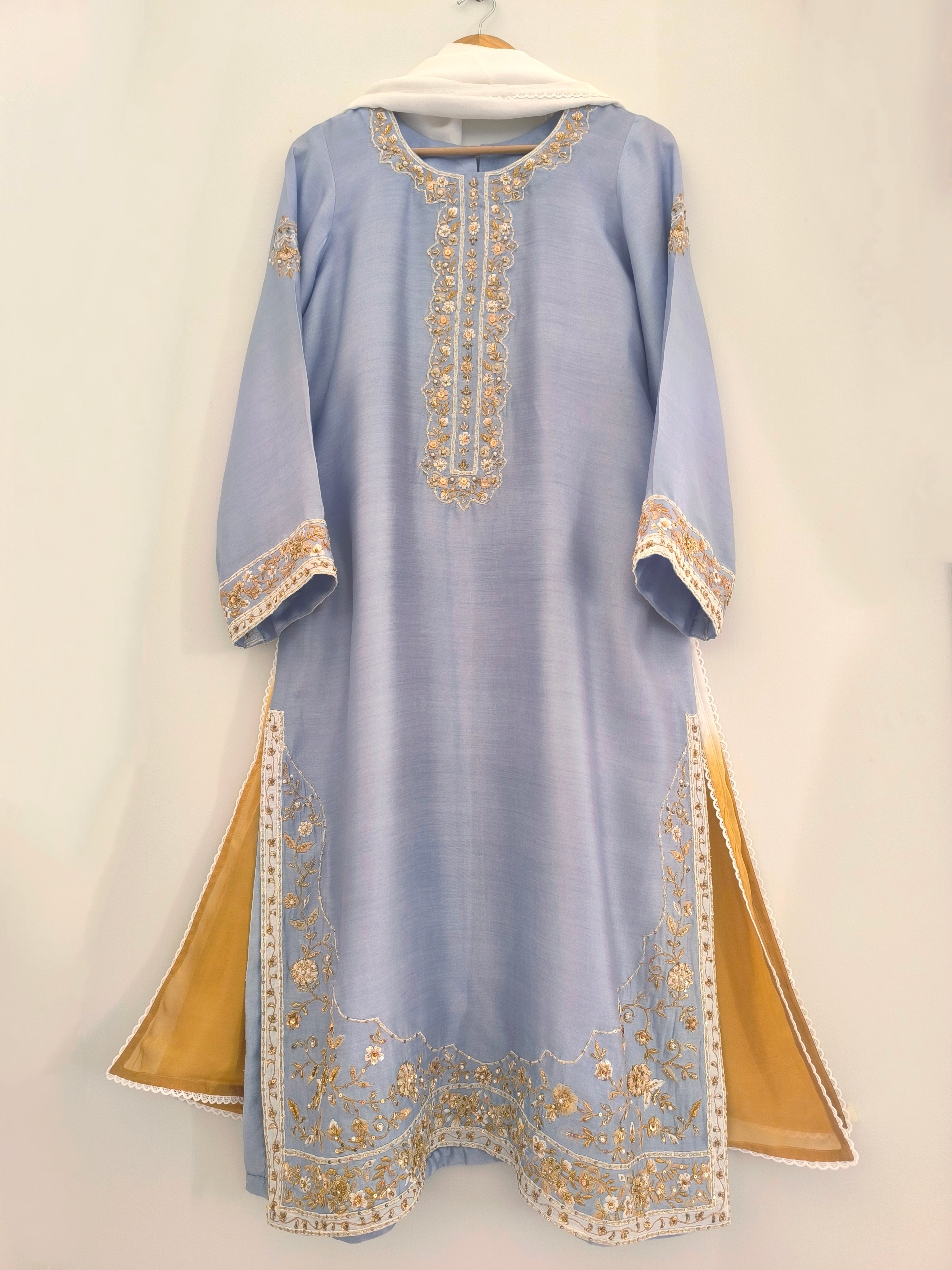 Mumtaz features a baby-blue sheesha cotton shirt with matching culottes, elevated by fine white resham florals, antique-gold zari work, and hints of sequin and naqshi for a refined, royal finish.