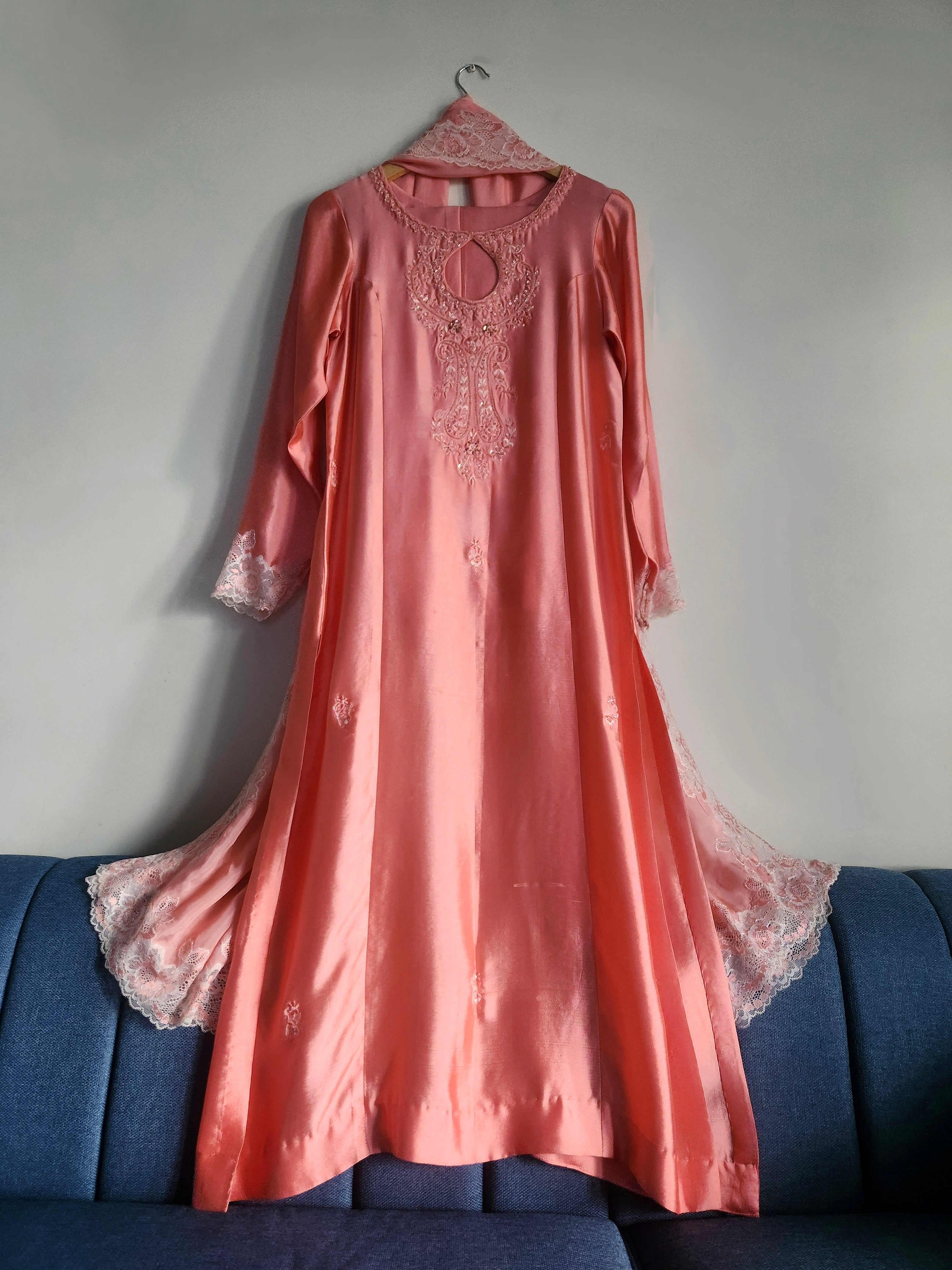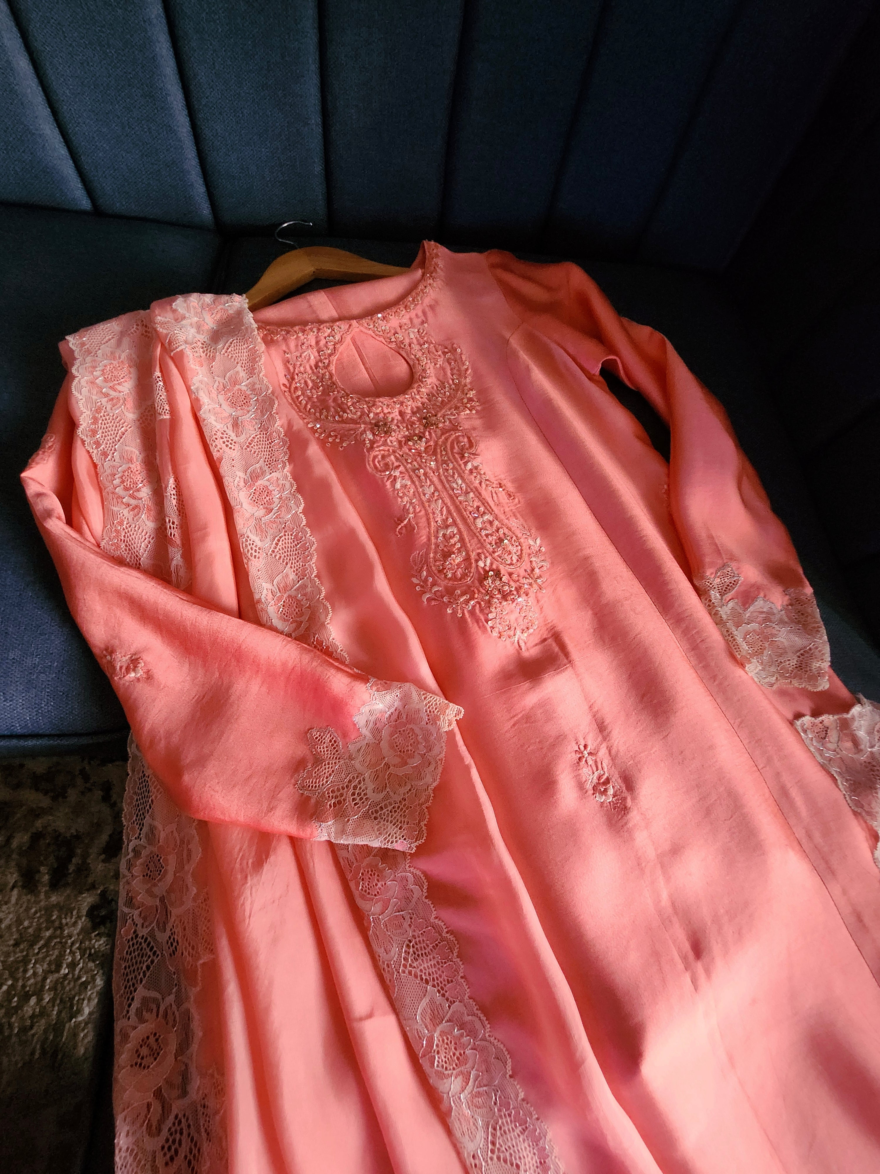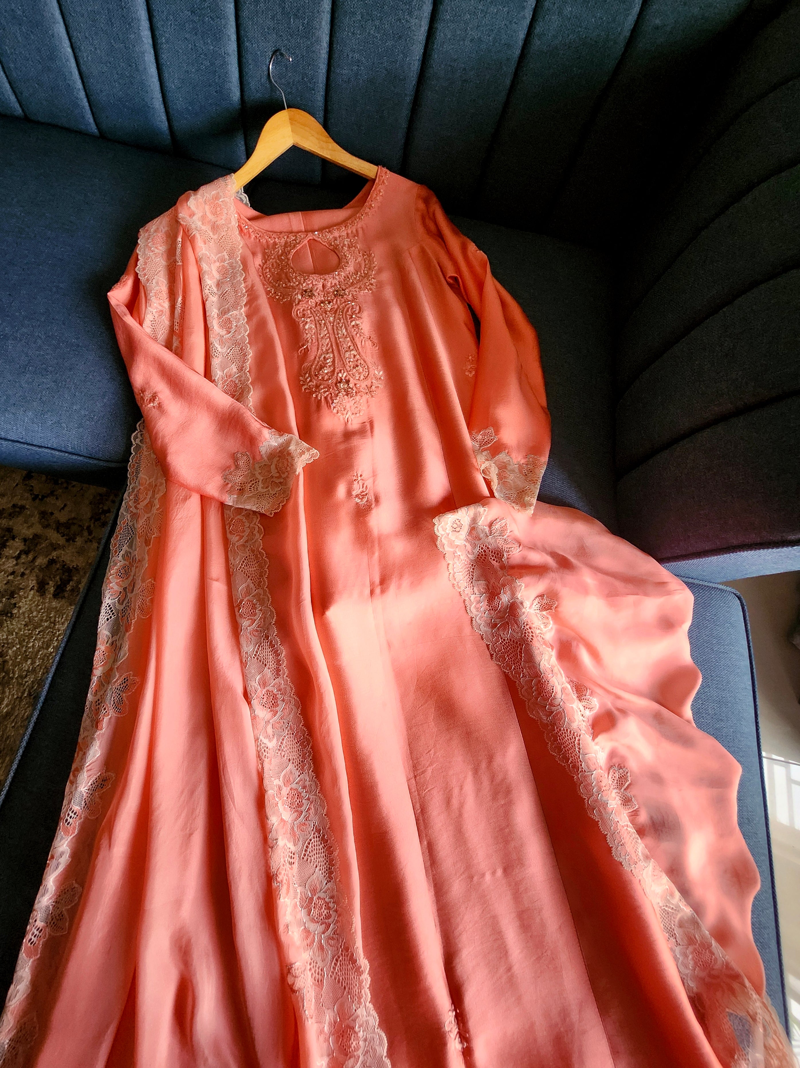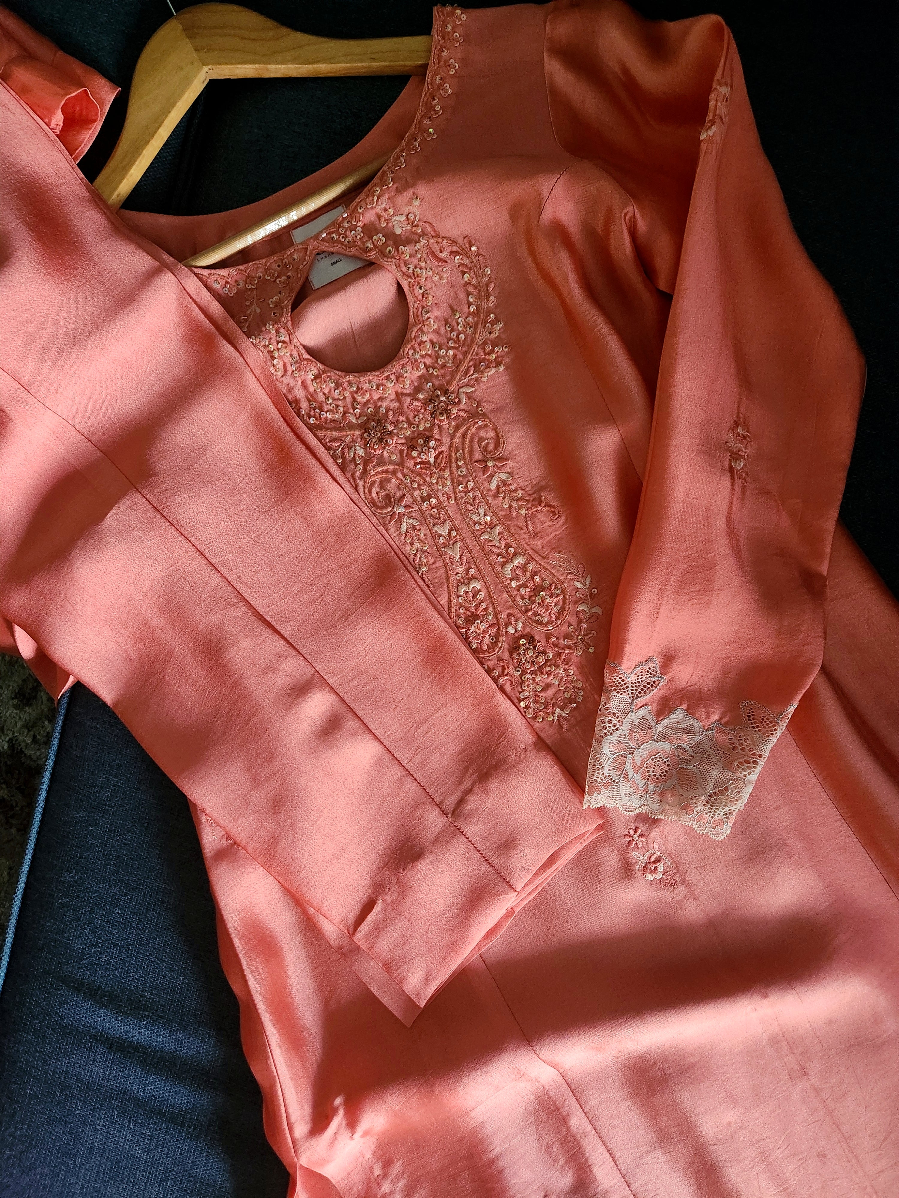 Naaz is a silk outfit in a fresh peach-coral tone and features princess panels that are distinct in our silk range. They create a clean, flattering silhouette for all body shapes. The embroidery on the neckline is traditional, with a modern edge.