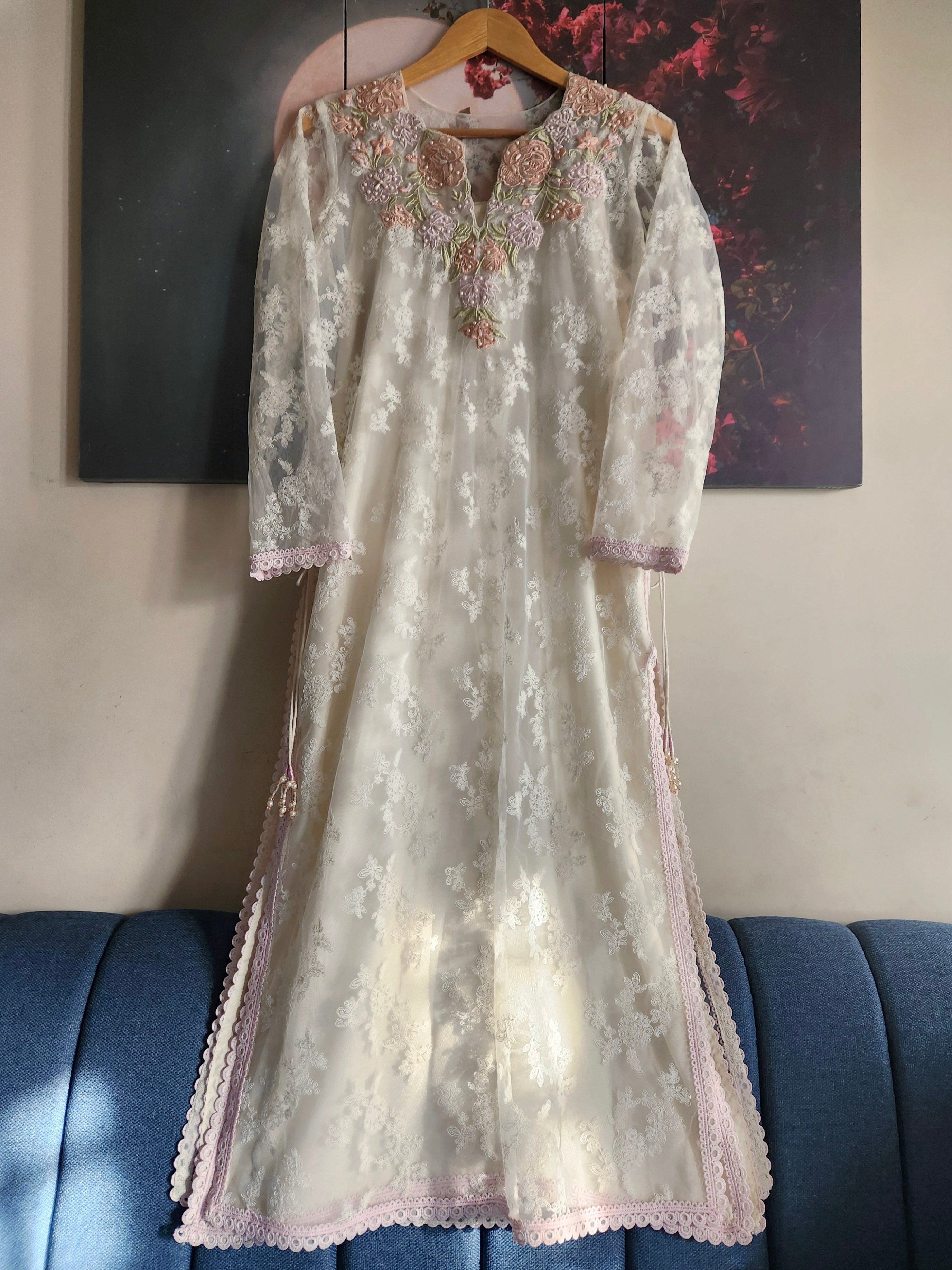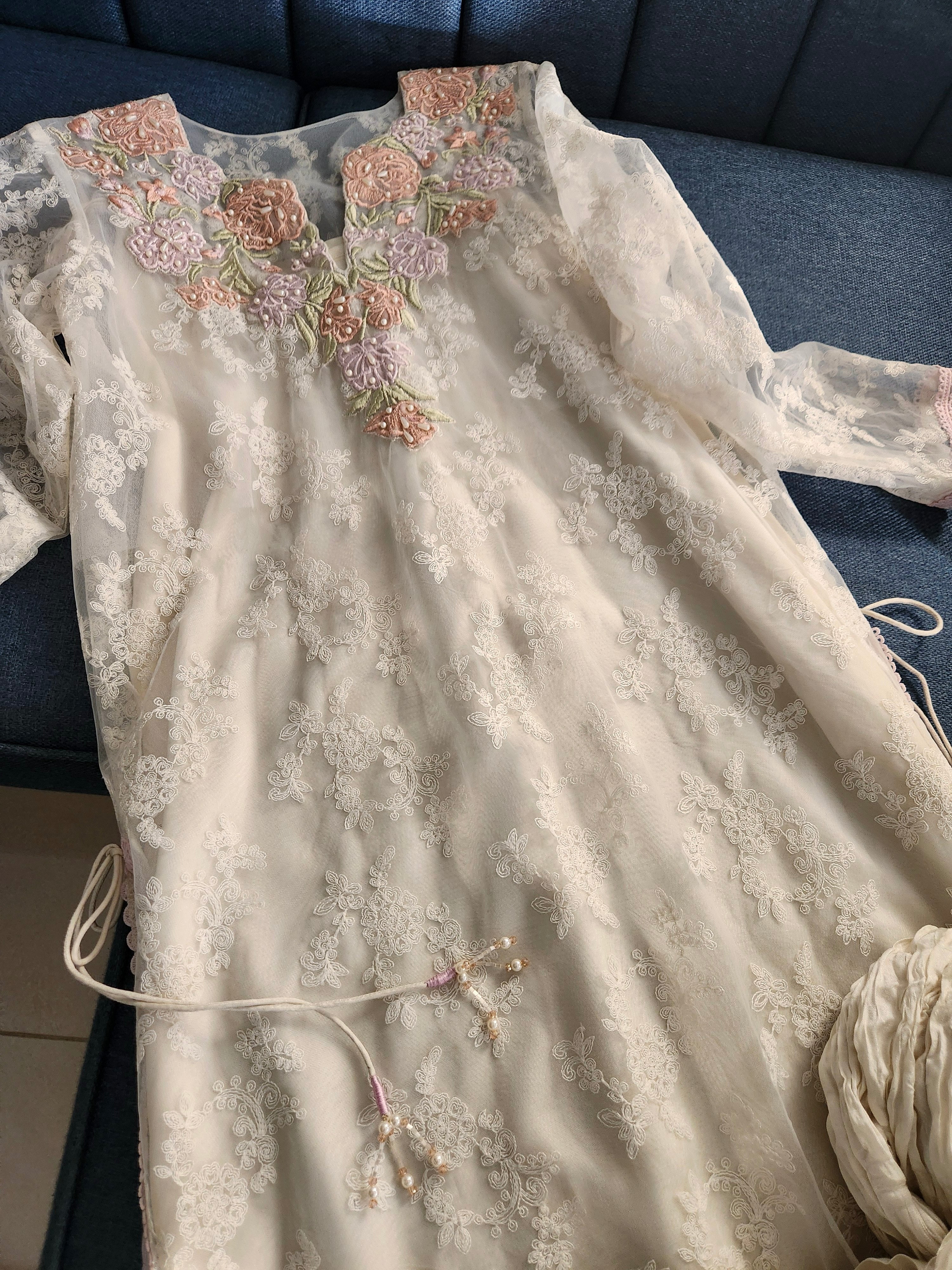 A vision in soft pastels, Nureh is crafted from sheer net, adorned with intricate embroidery that mimics delicate floral tracery. The matching slip, finished with a lace hem, adds unexpected playfulness, making this ensemble perfect for intimate gatherings and festive soirées. Designed for those who appreciate subtle luxury, this dress is an invitation to embrace elegance in its purest form.
