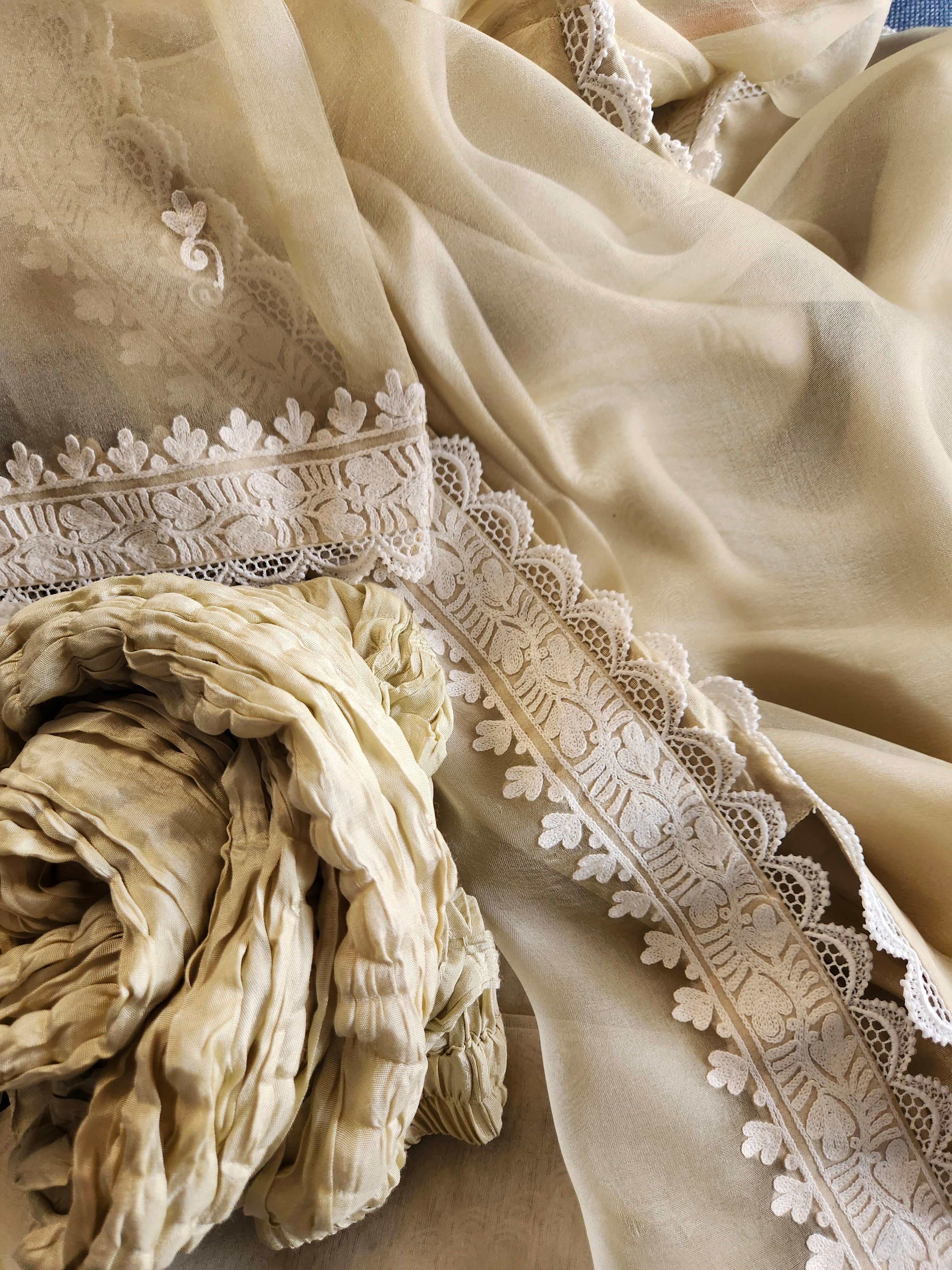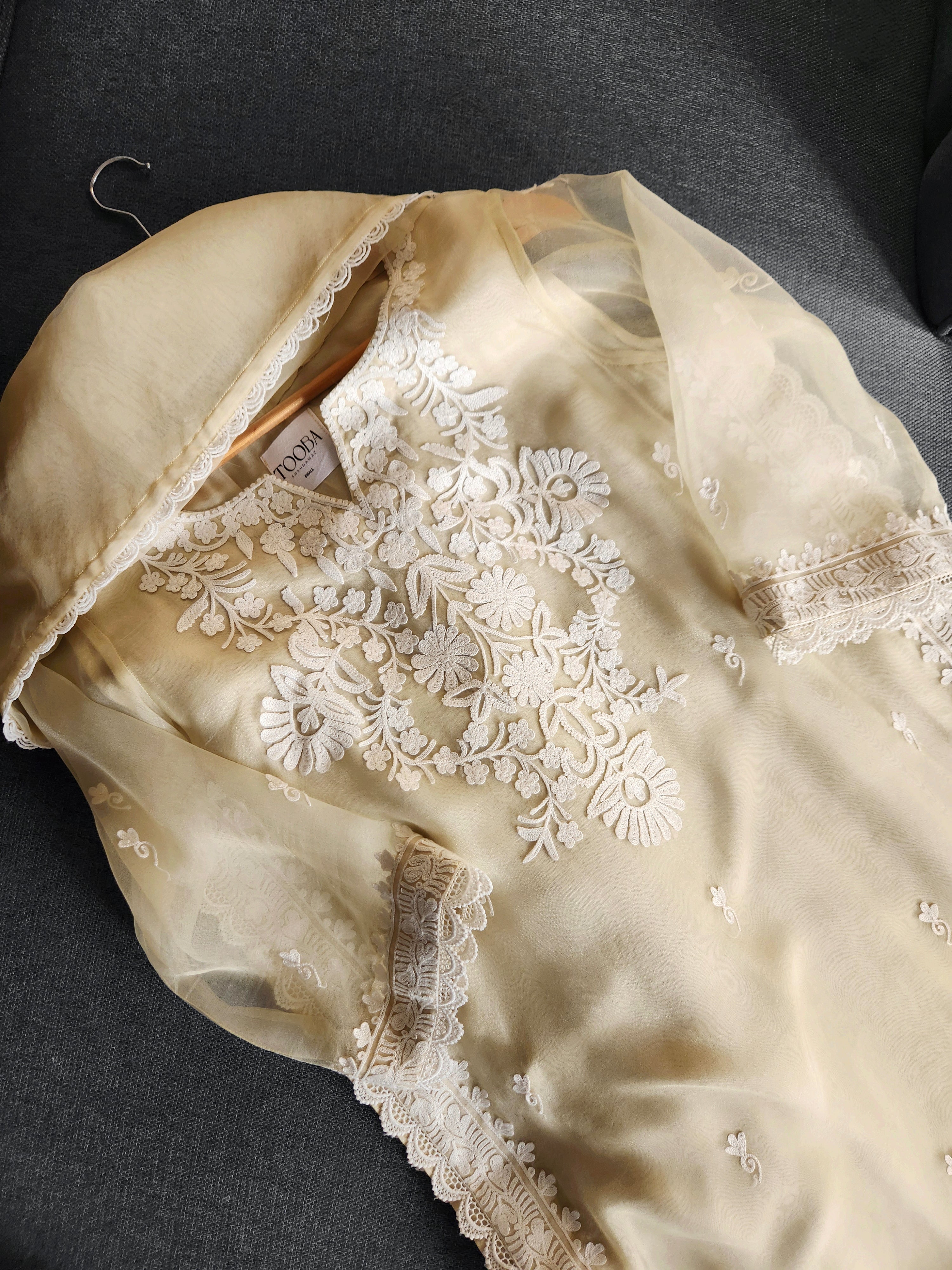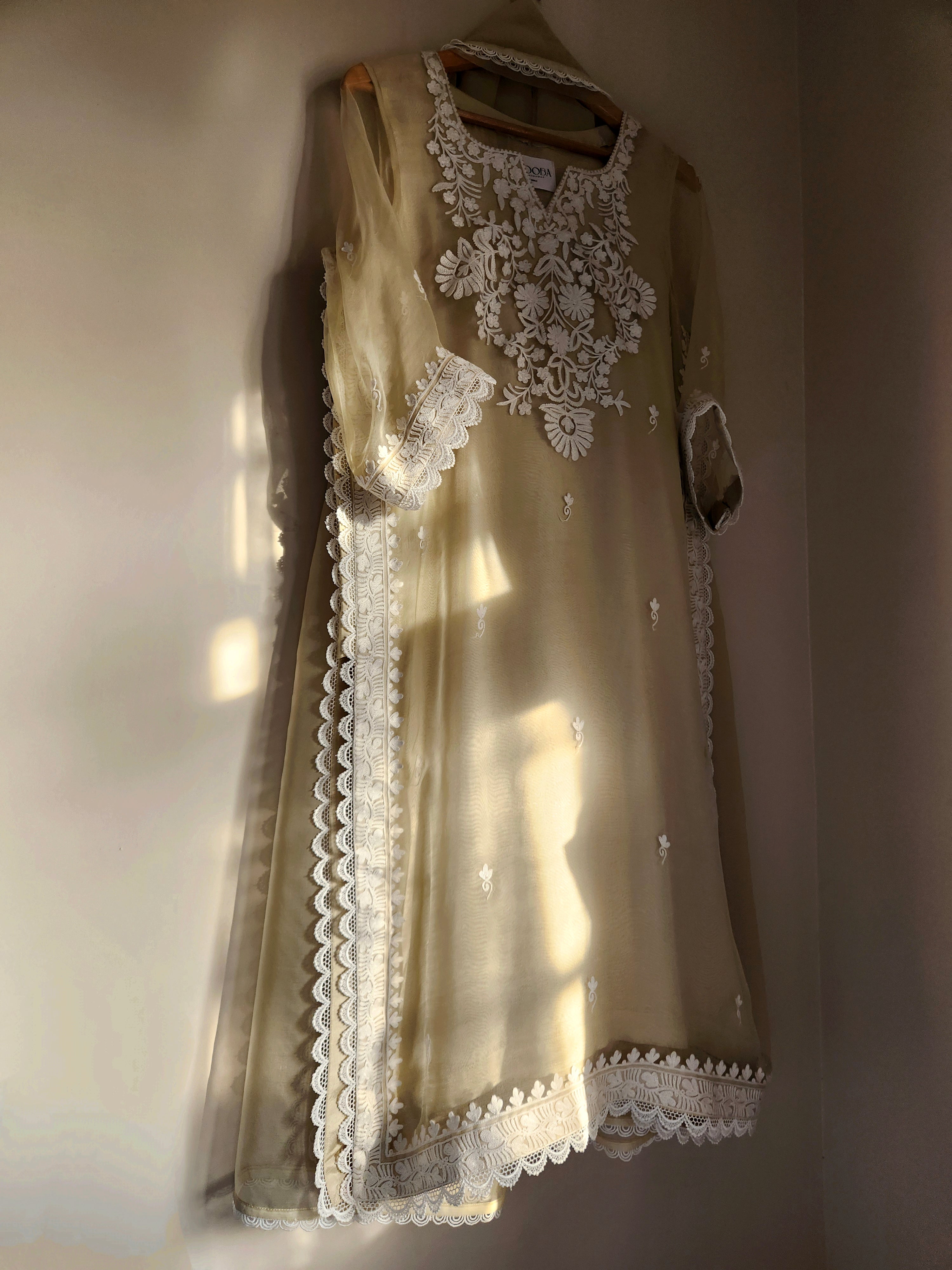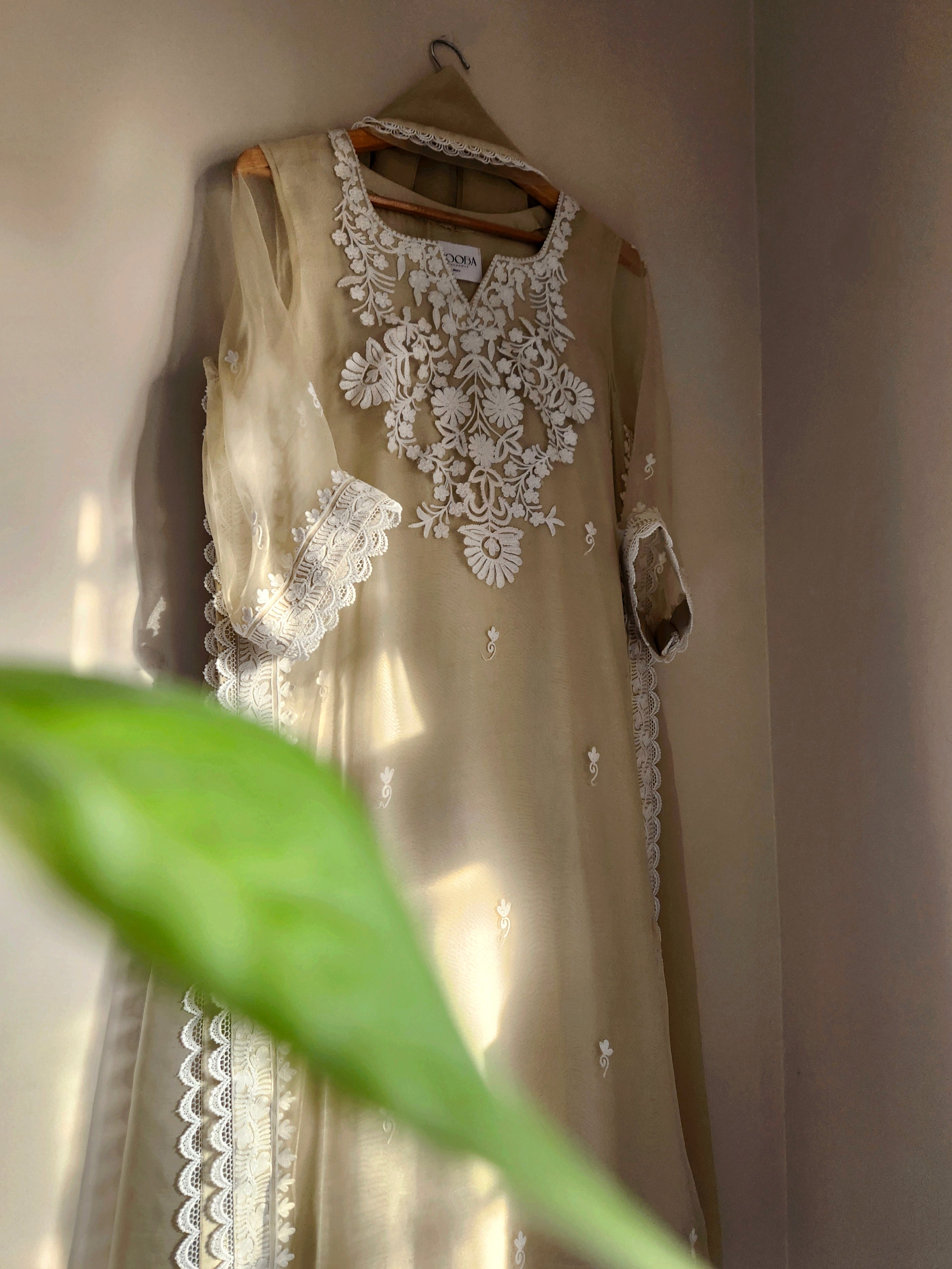 Meet your new favorite, Haze. It is an organza shirt with detailed Ari embroidery on the front, back and sleeves. The lace finishing adds a touch of romance to the overall look. It's paired with crushed cotton-silk pants.