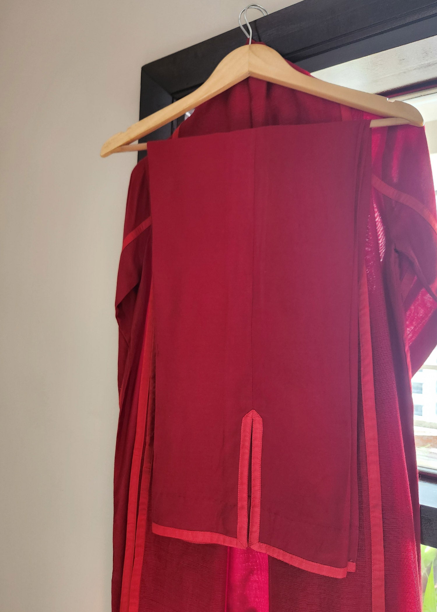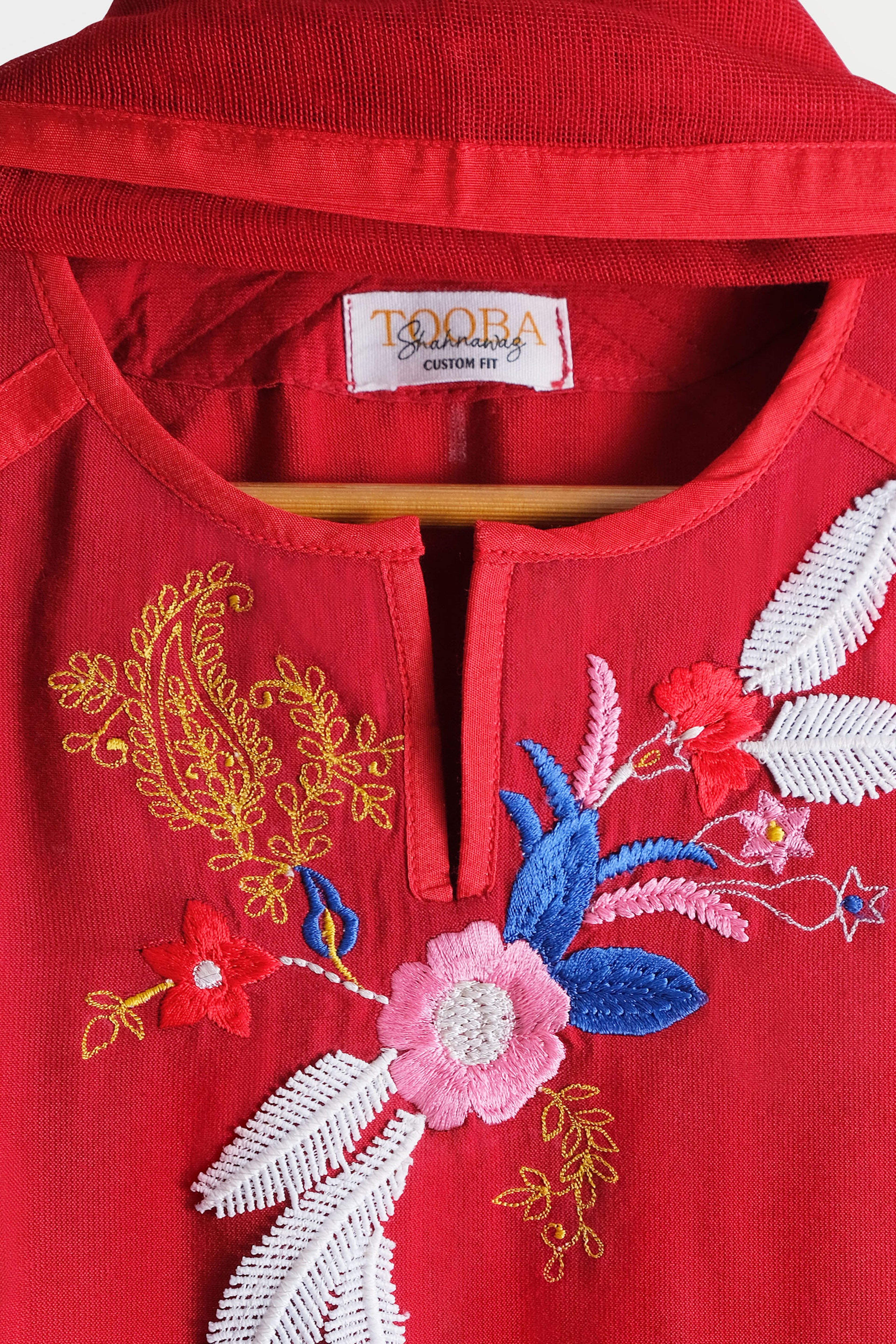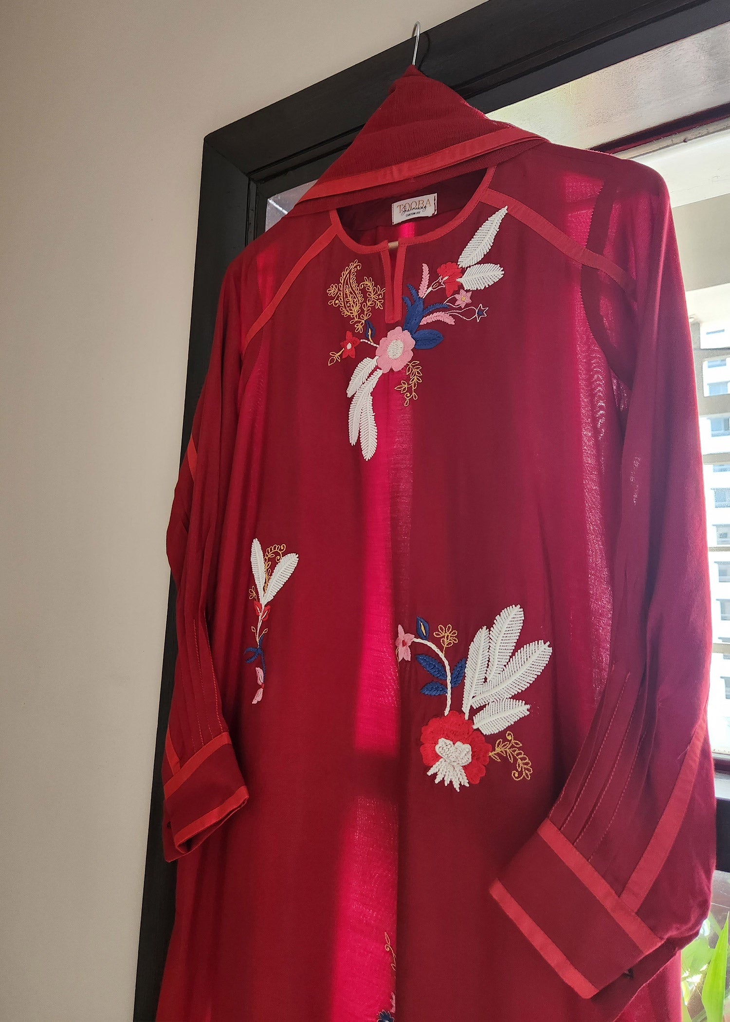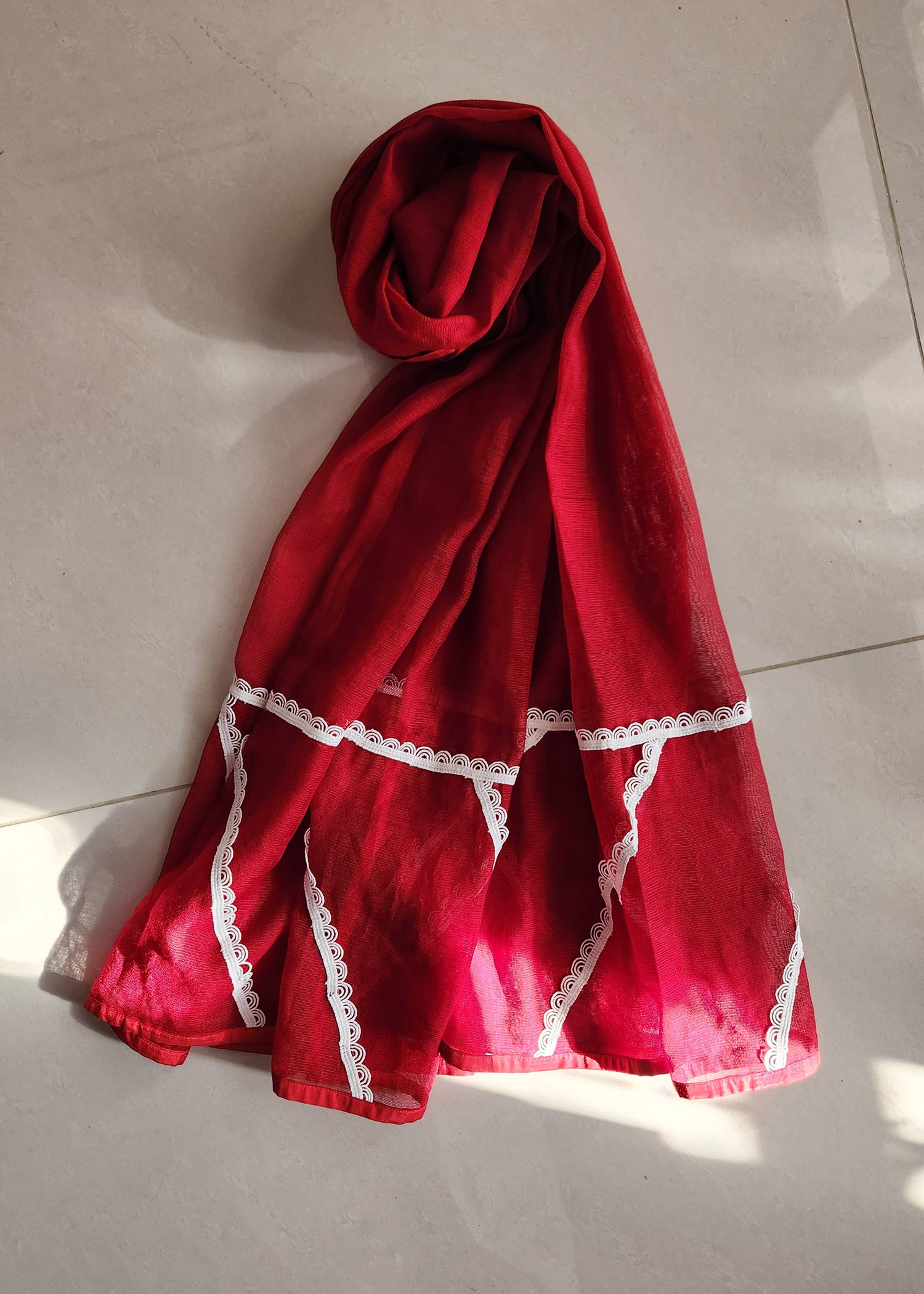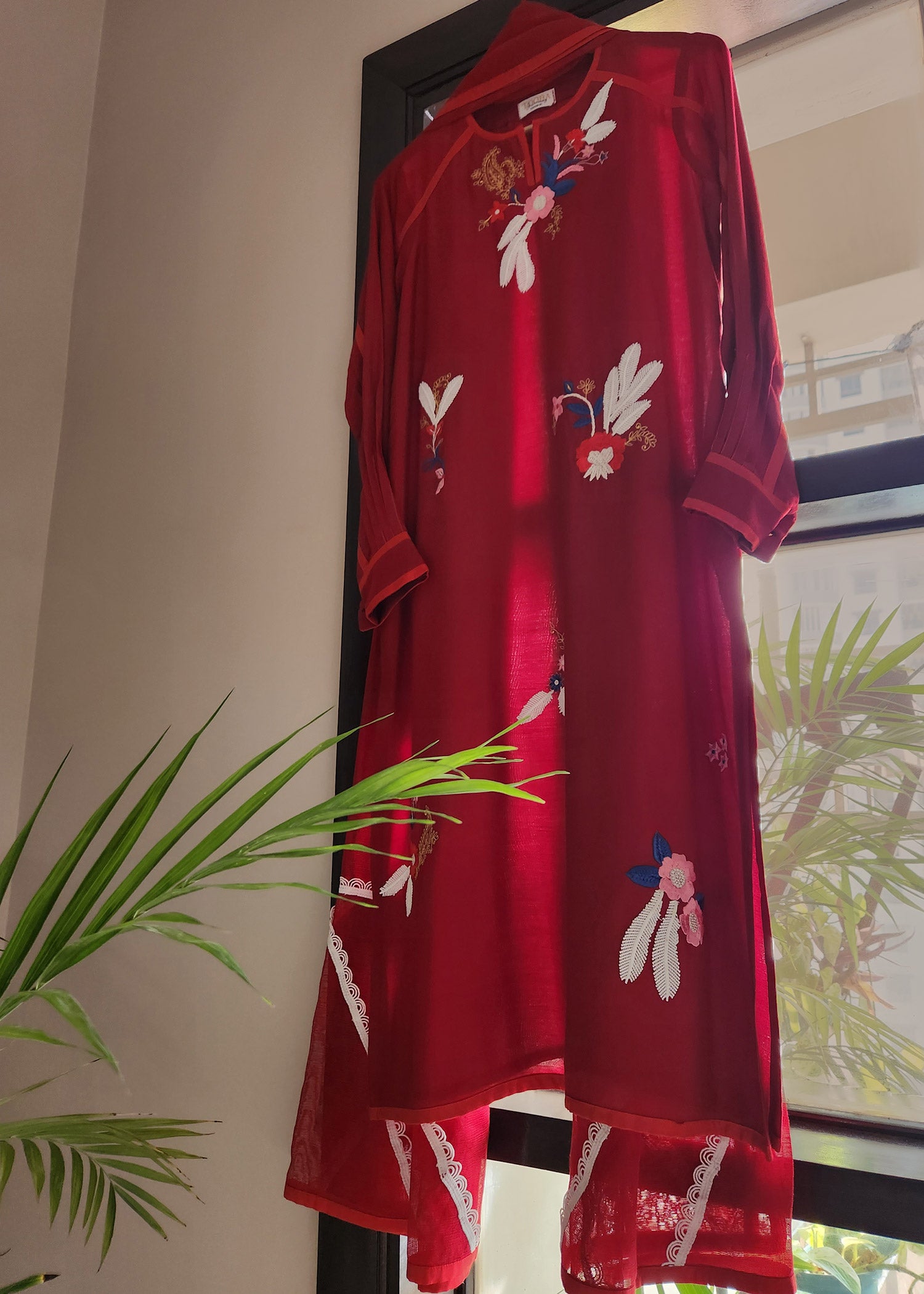 Hibiscus is a deep-red set in cotton net with detailed embroidery and lace appliques. The running red stripe applique in our signature style brings everything together. Pair it with a khaddi-net dupatta with intricate lace details.