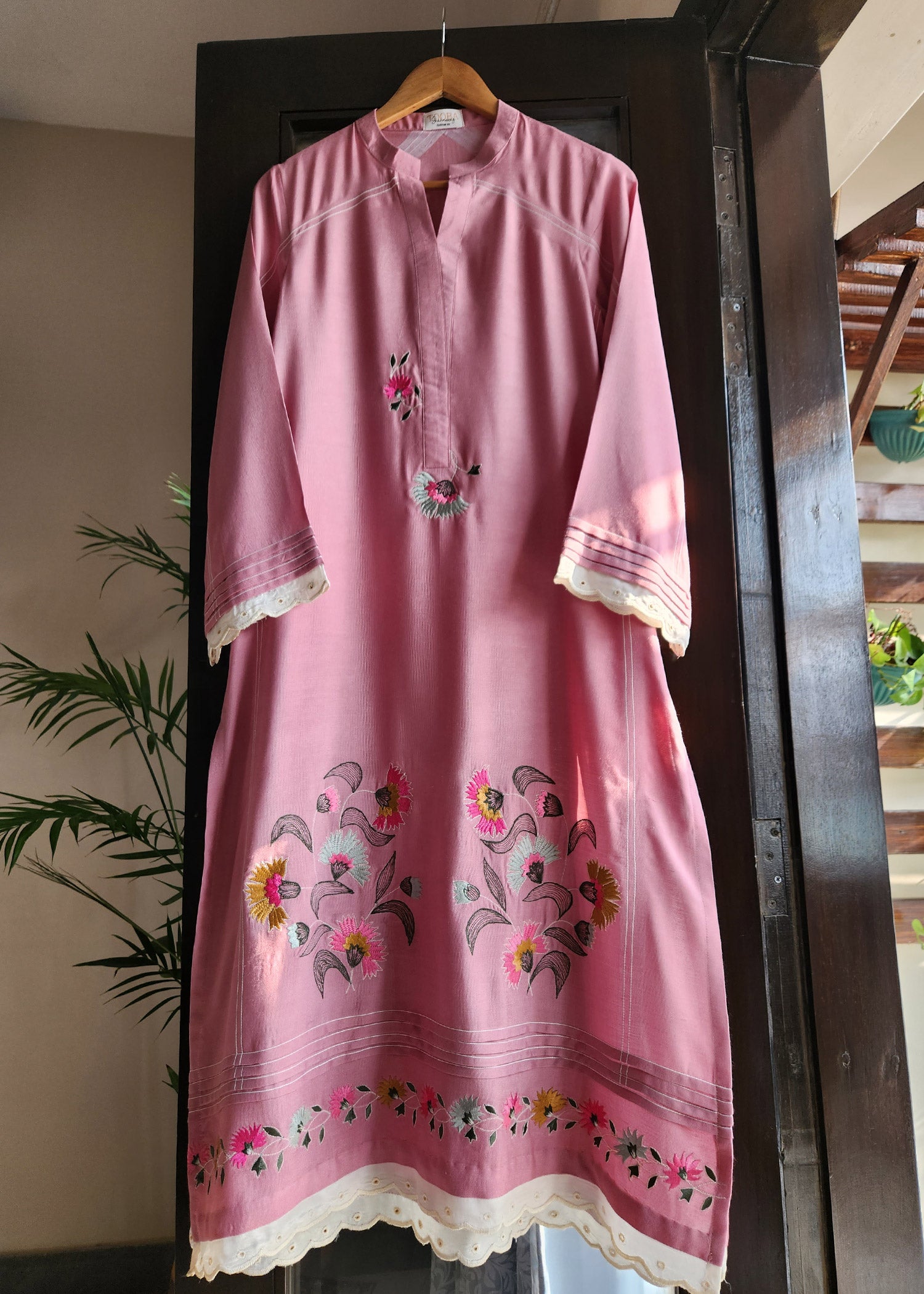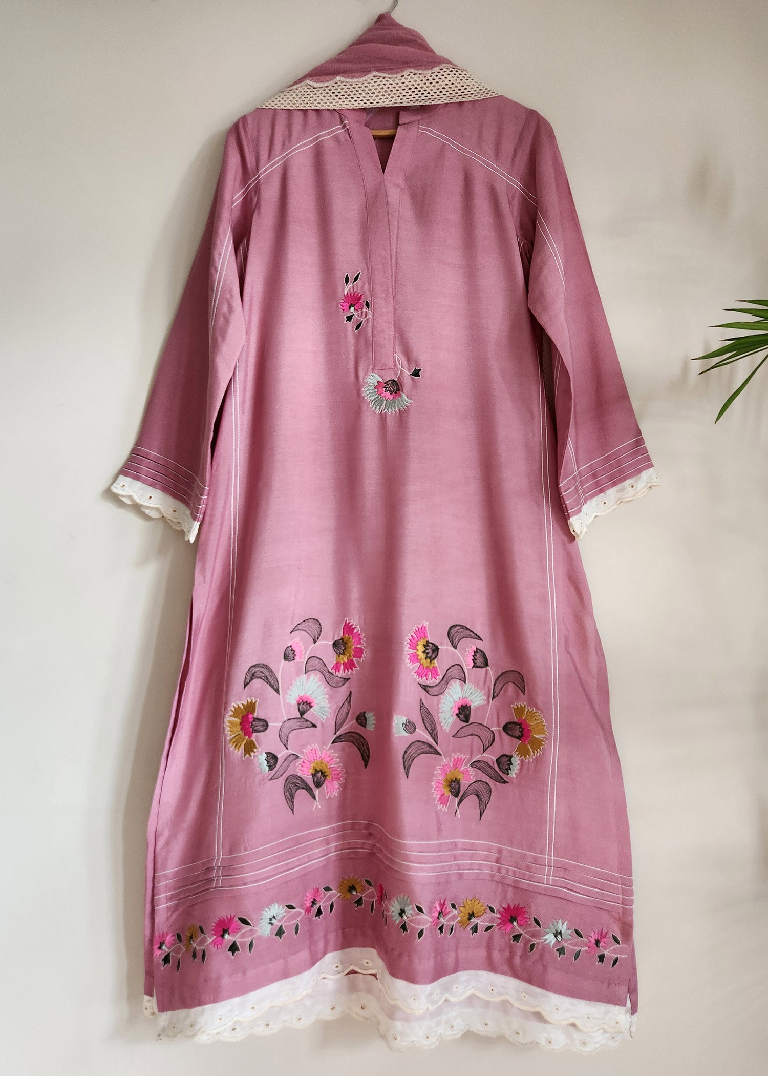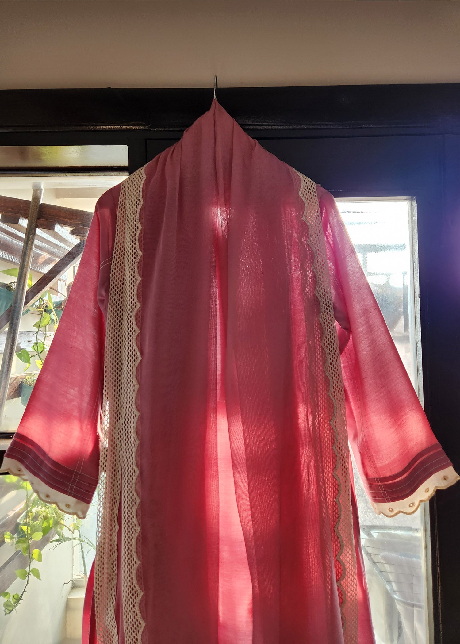 True to our aesthetic , Lily is a beautiful cotton net ensemble rich in detail. The two-piece set features unique embroidery and immaculate pleating. Edged with cutwork scallops on the daaman and sleeves, the ensemble is long, flowy and flattering. Paired with our scalloped/laced dupatta , it's a wardrobe must-have for day-to-night soirees.