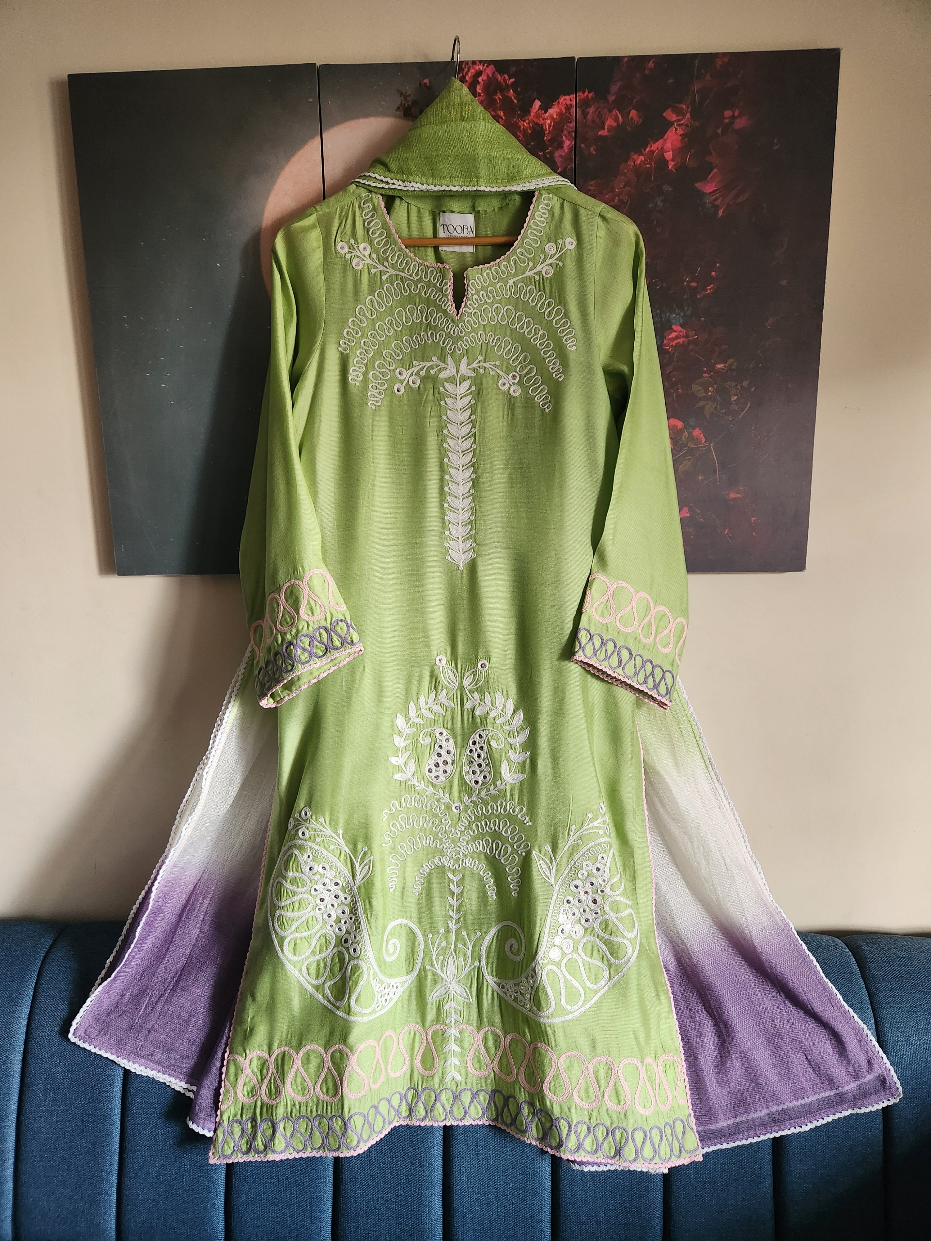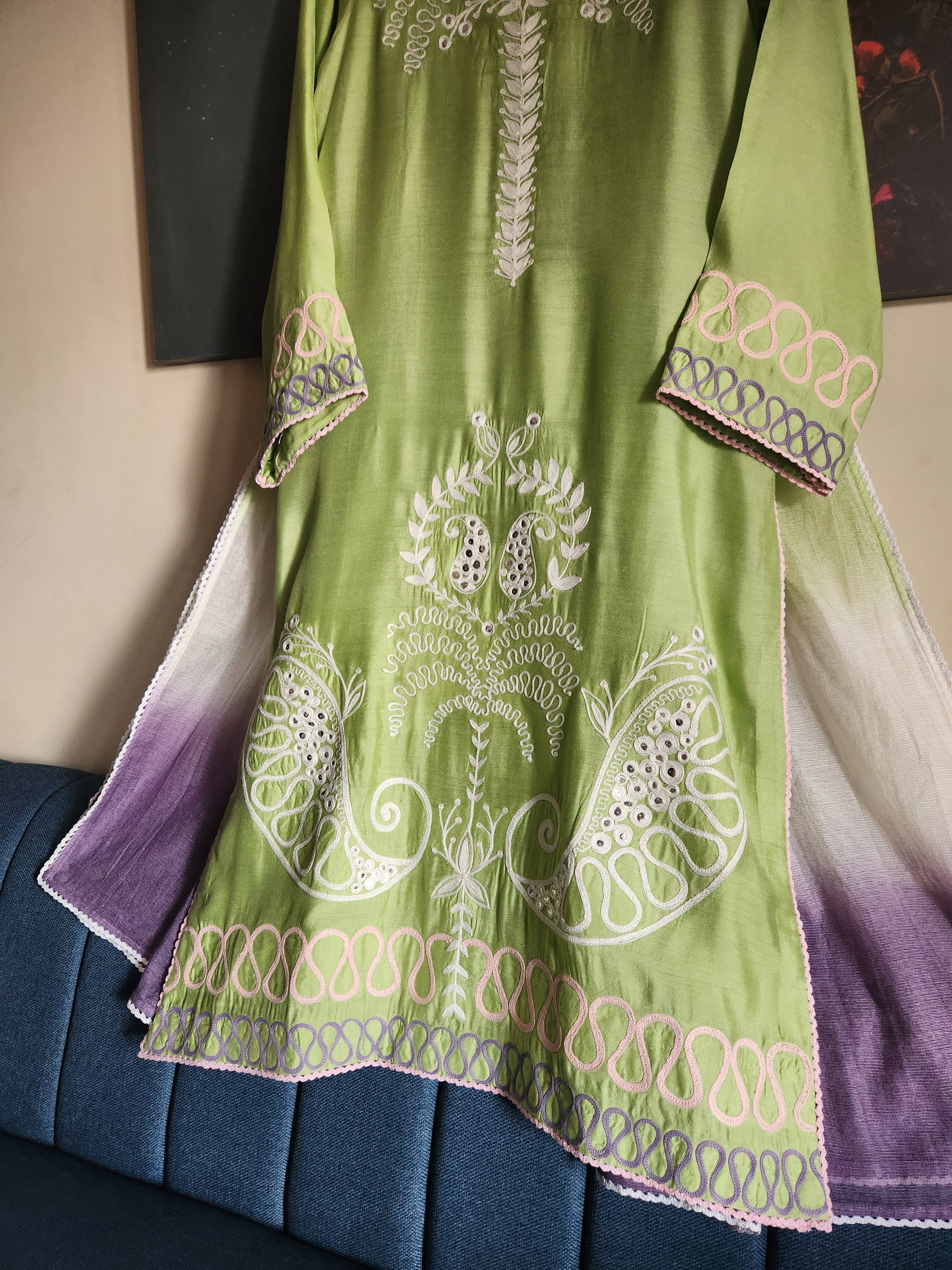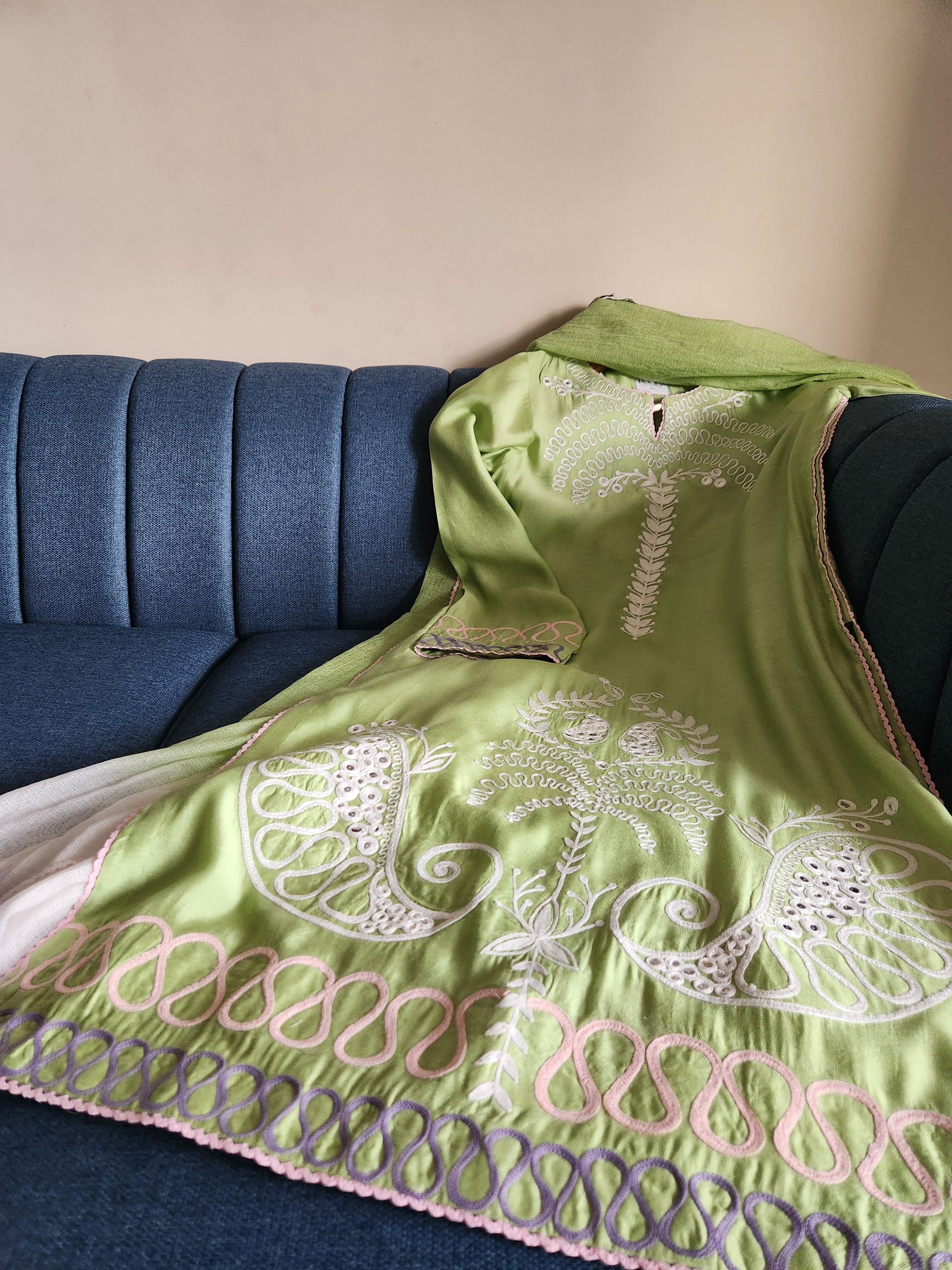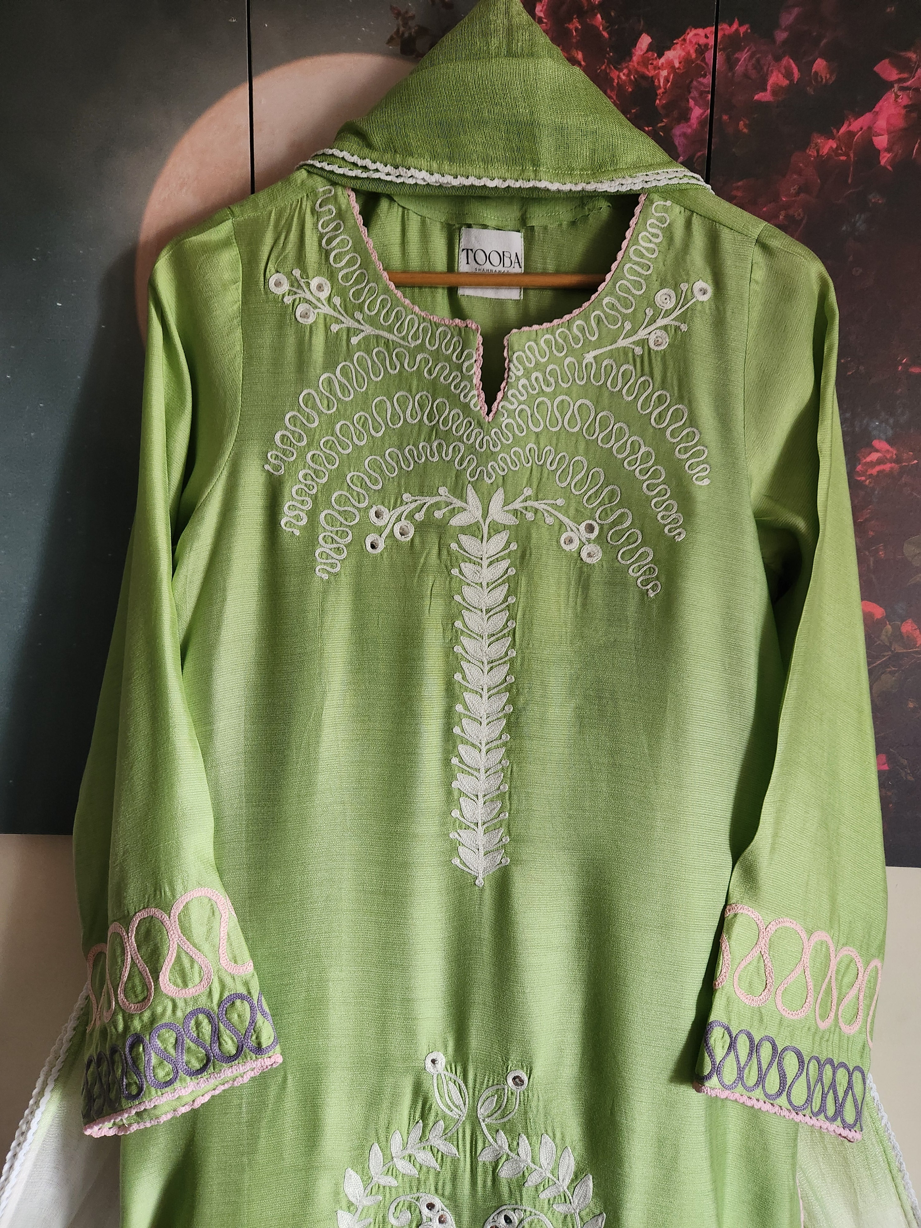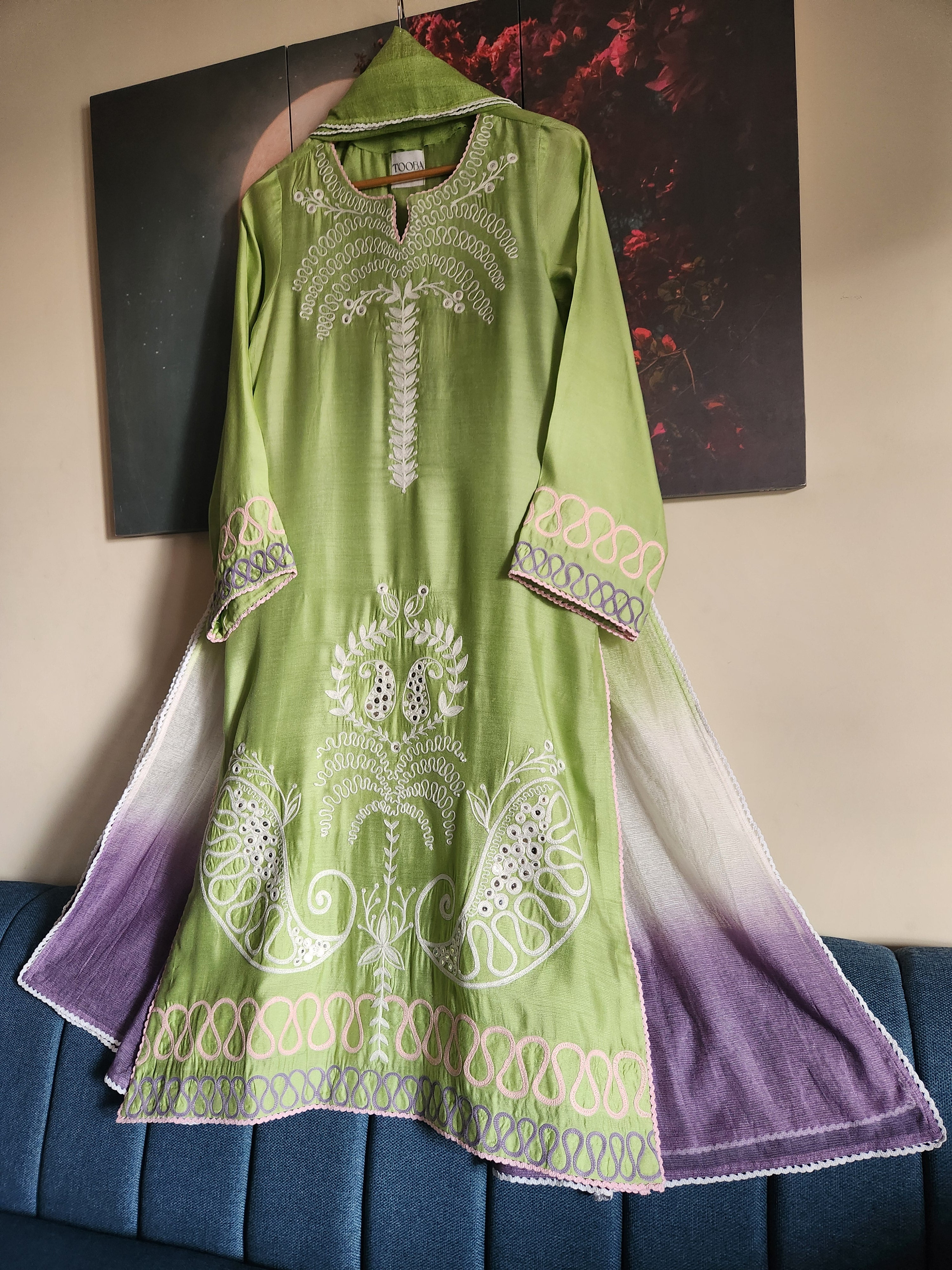 Nile is a two piece khaddi-silk set with unique embroidery on front, back and sleeves. Paired with a khadi net dupatta with lace edging, it is ideal for slow paced soirees.