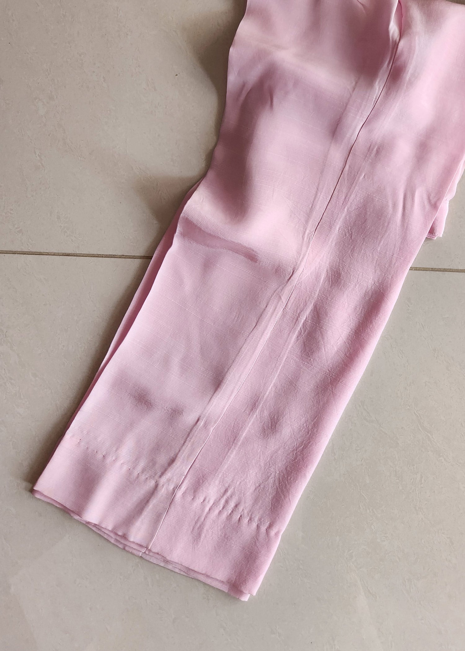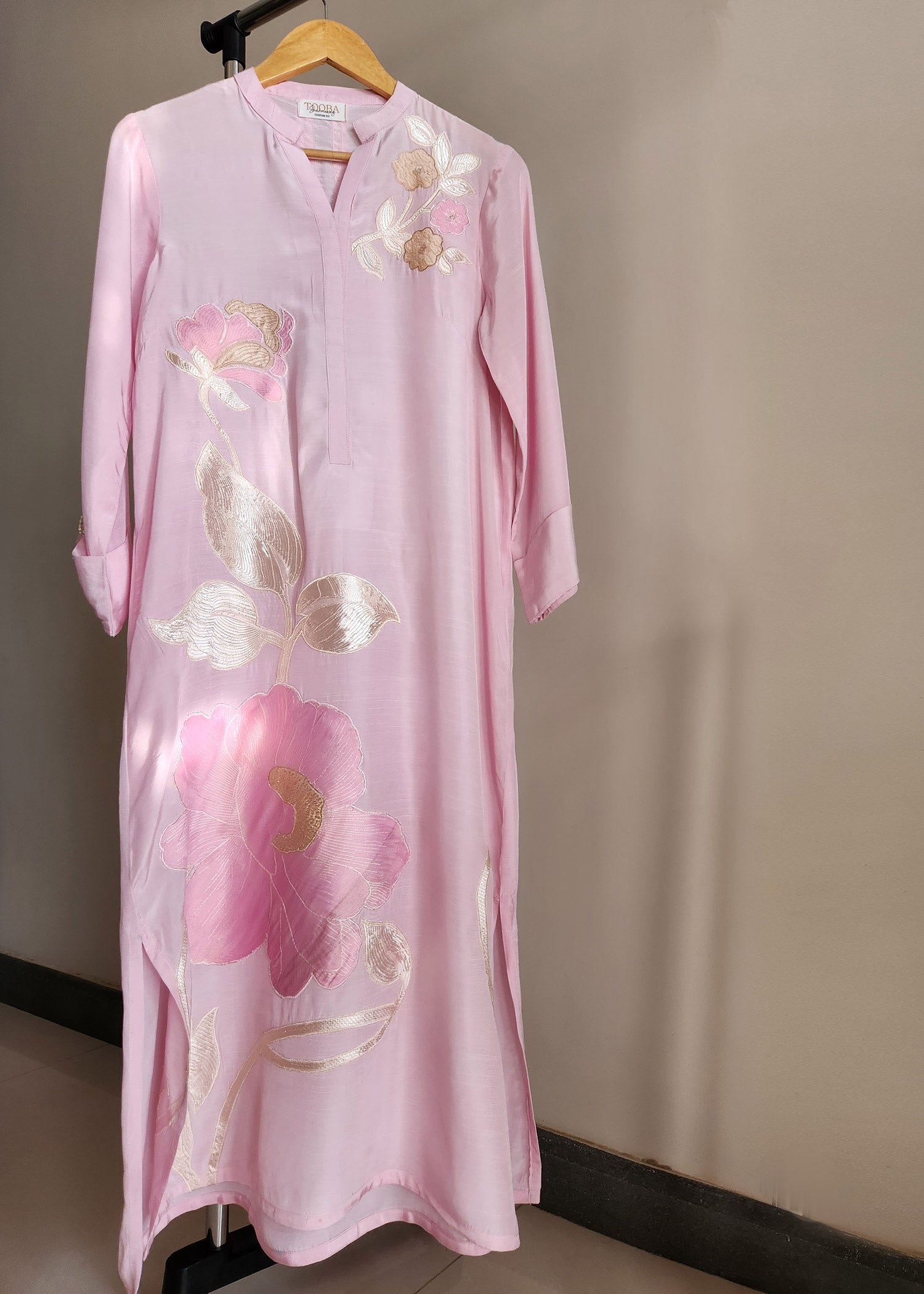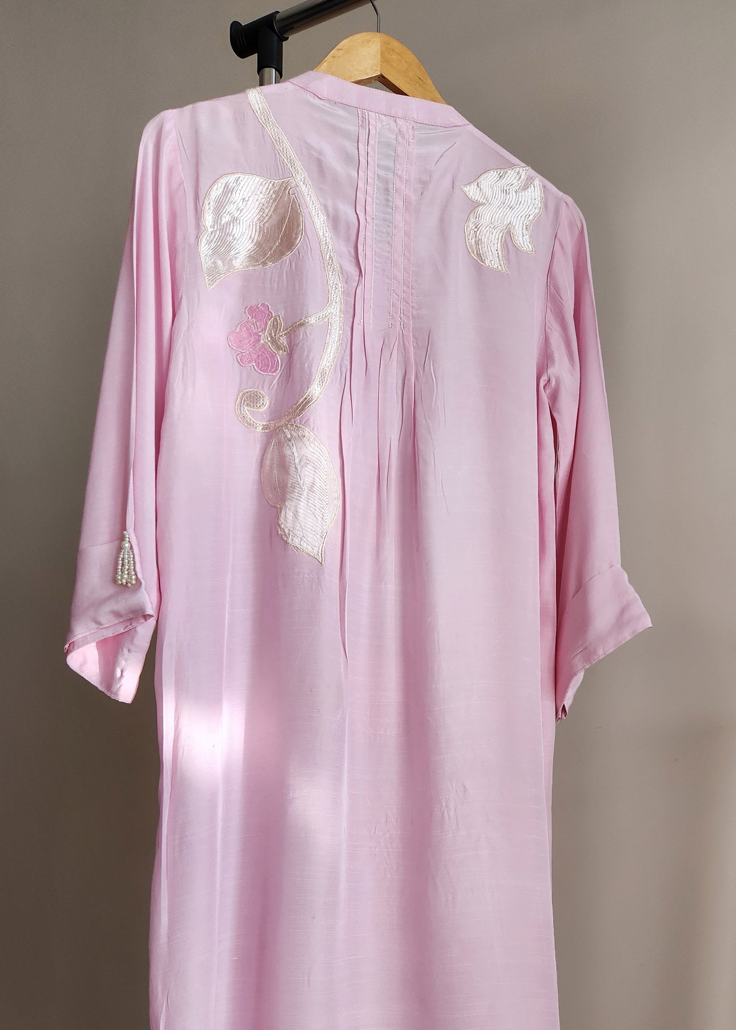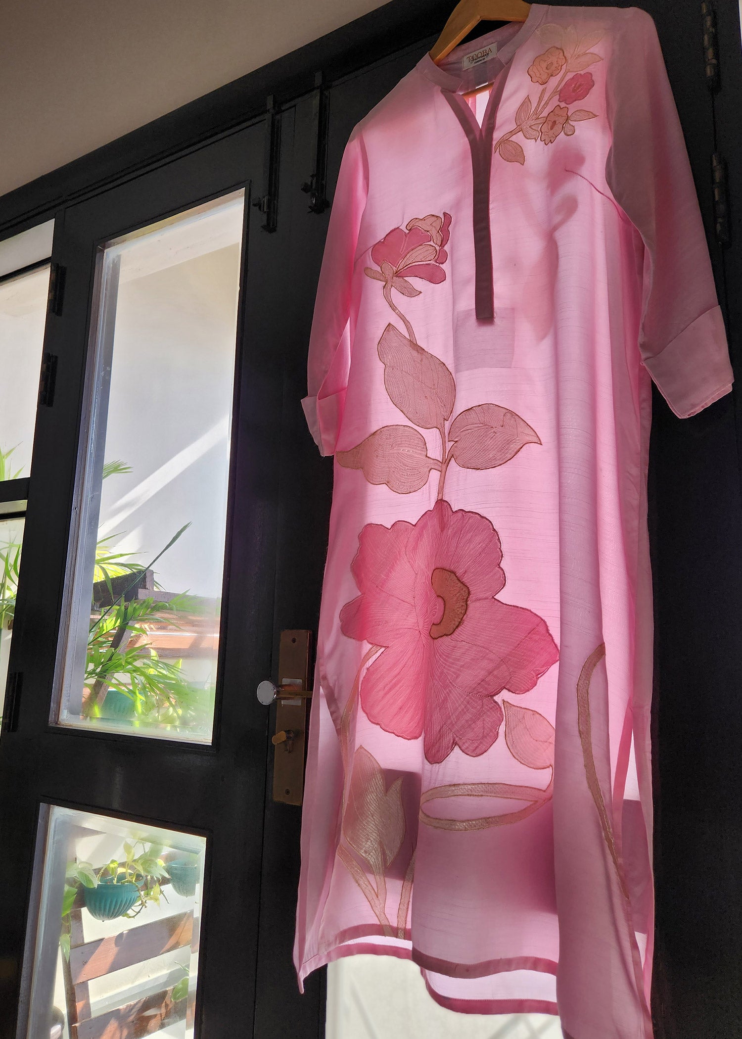 Princess Dreams. A beautiful silk number with bold floral applique running through the front and back shoulder. The milky pearls on the sleeves and intricate gold detailing in the flowers add to the set's subtle charm. The back is pleated, and the shoulders oversized to give the shirt a kaftan-like relaxed look. Paired with flowy silk culottes, it brings together both style and comfort.