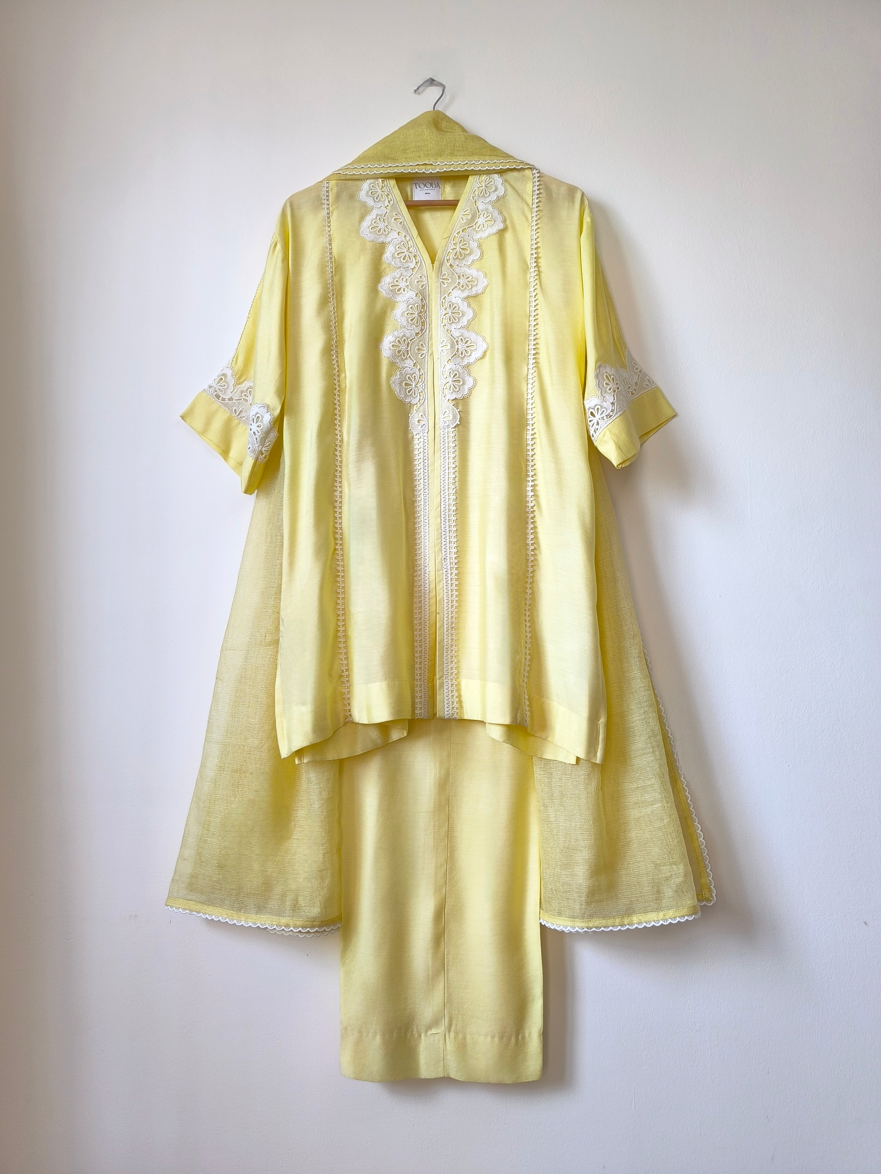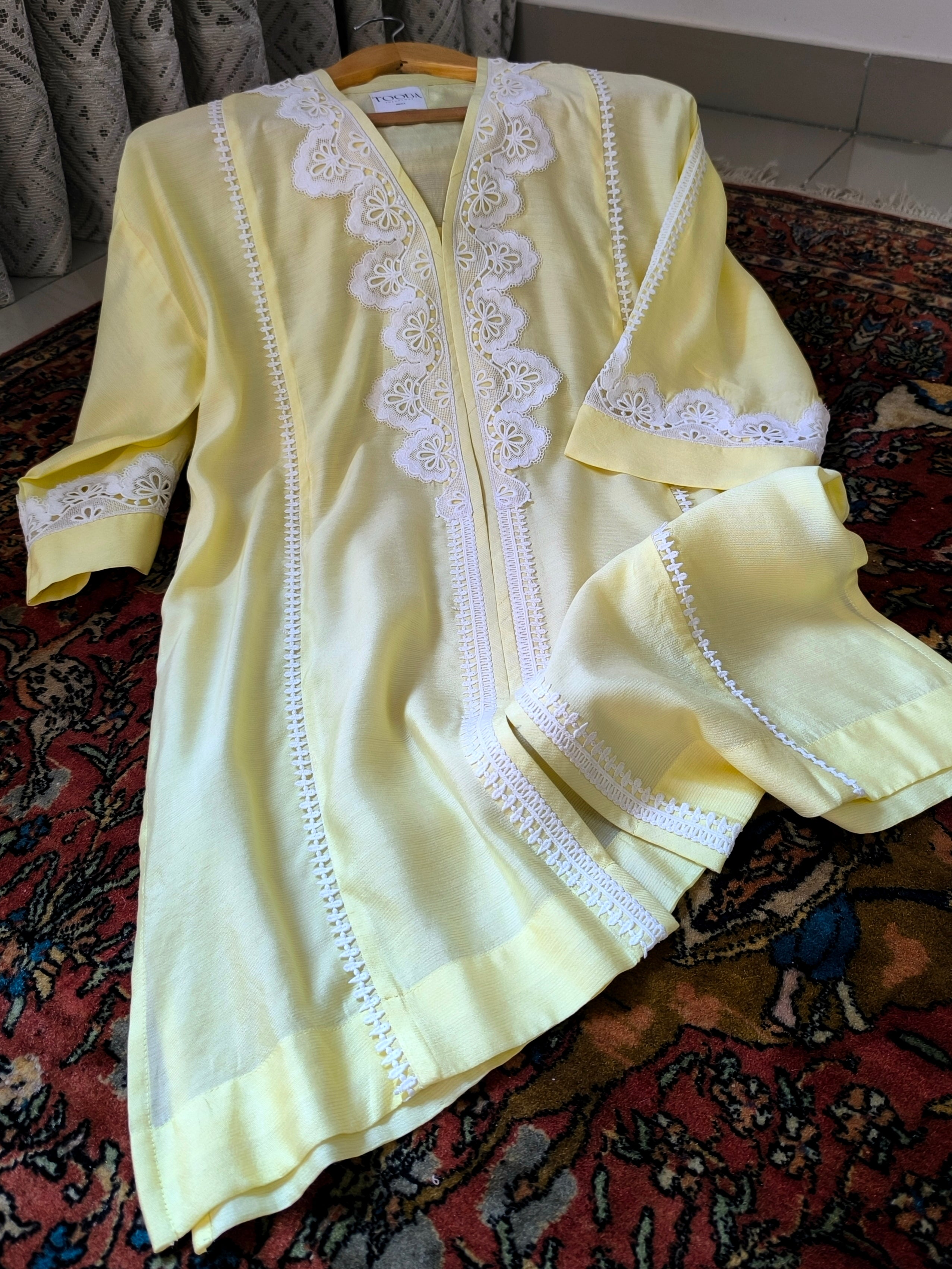‘Zeni' is a khaddi silk set designed for effortless elegance. Crafted from flowy pure silk with a subtle sheen, it offers comfort without compromising on sophistication. Detailed with delicate lace on the front, back and sleeves, this versatile piece brings refinement and ease to any occasion.