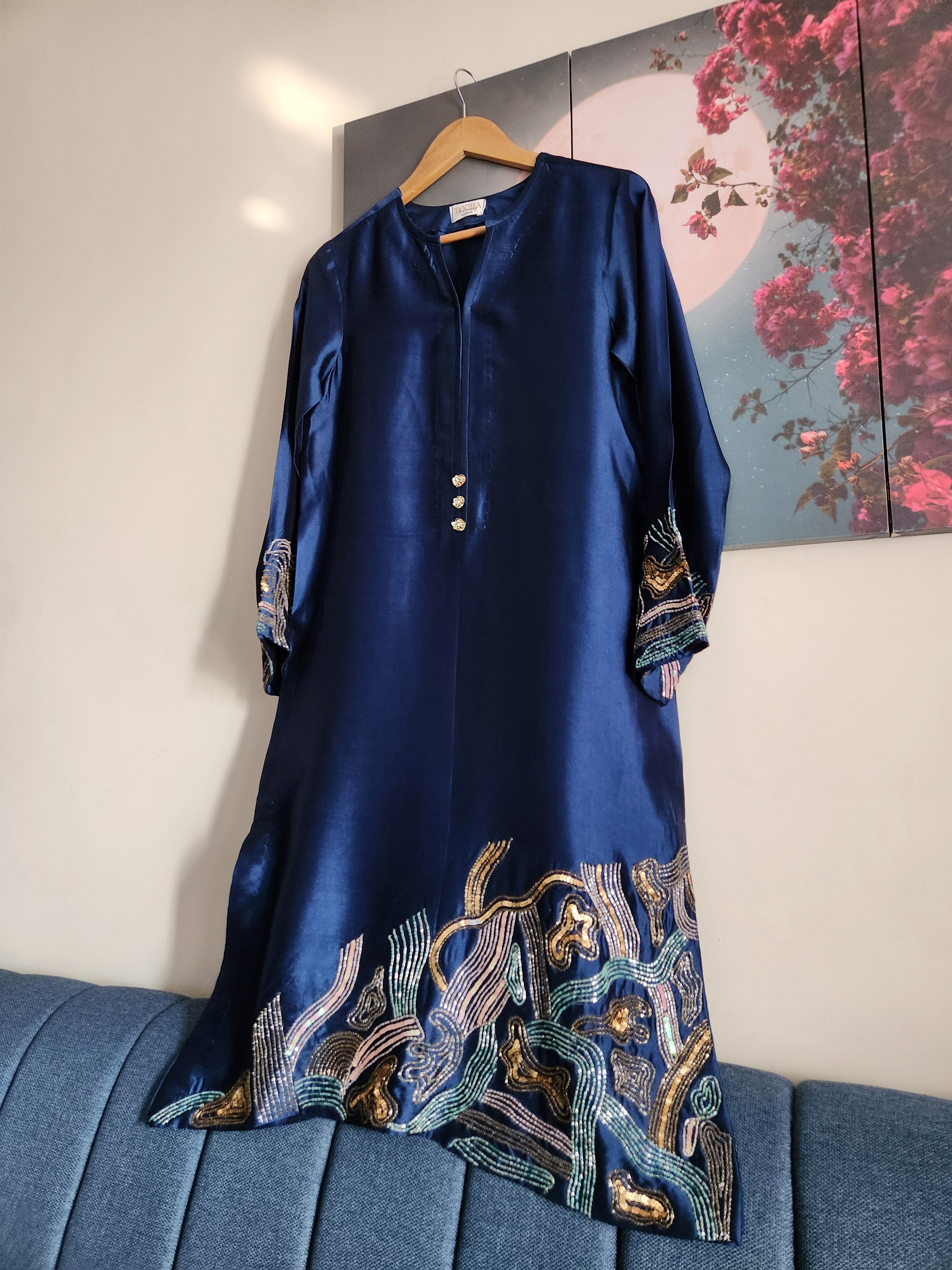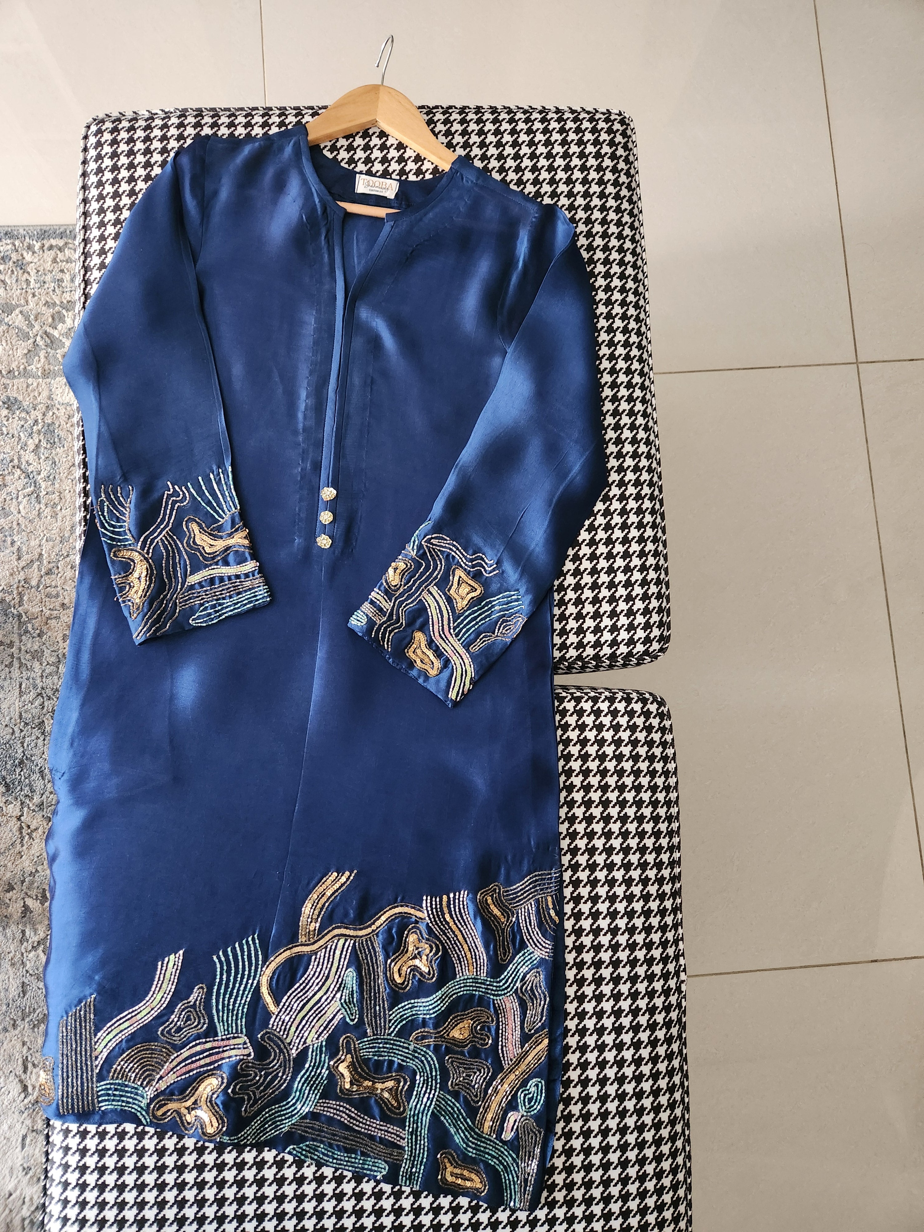 'Wave' is a striking shirt and pants set in pure sheesha silk. The vibrant blue hue meets modern, clean cuts, while intricate needlework with sequins adds a touch of sparkle along the daaman and sleeves. Versatile enough for any occasion, this set can be paired with an organza chan dupatta (as shown), edged with gold Kiran, for a look that's equal parts elegance and sophistication. Perfect for the woman who loves understated glamour with a modern twist.