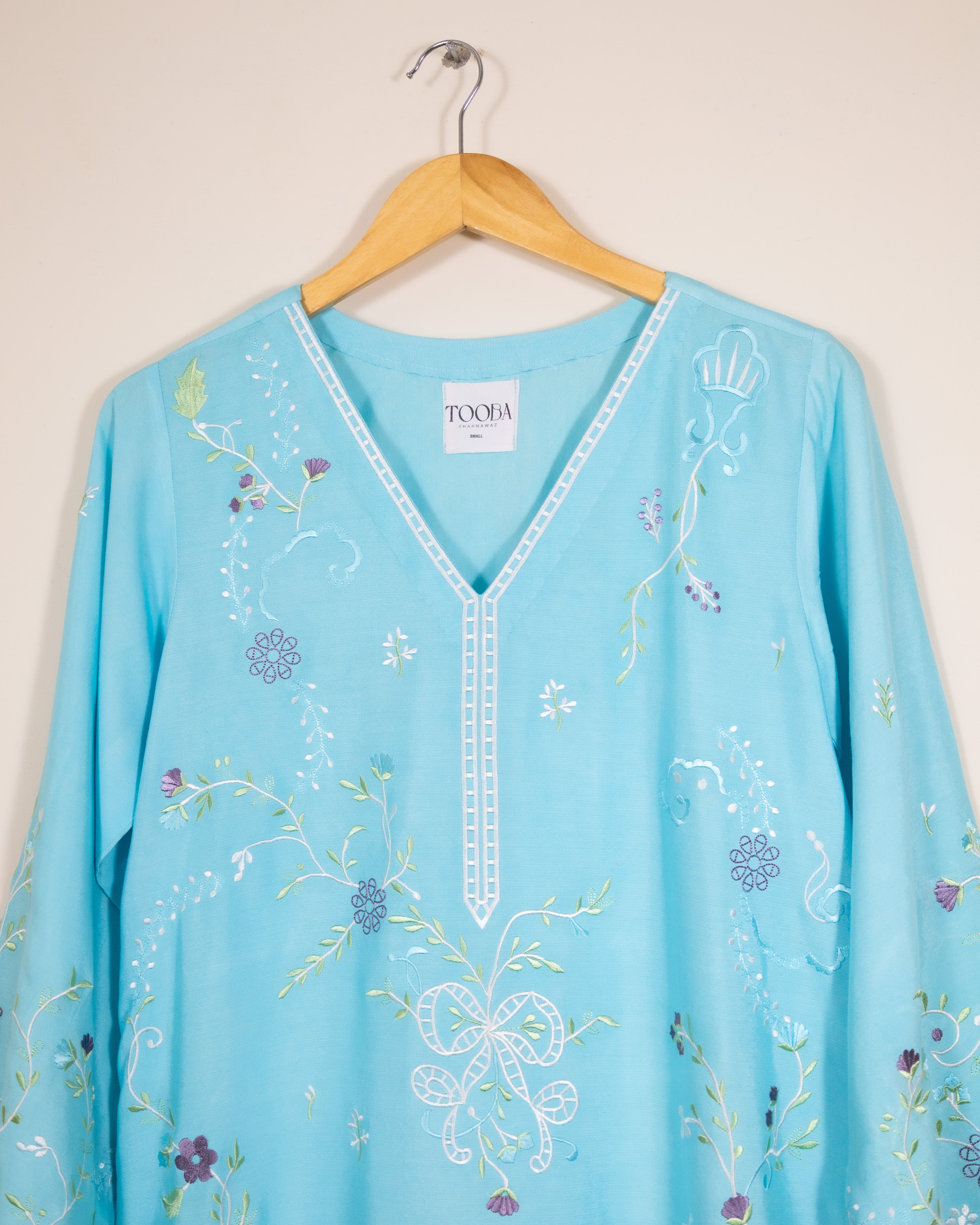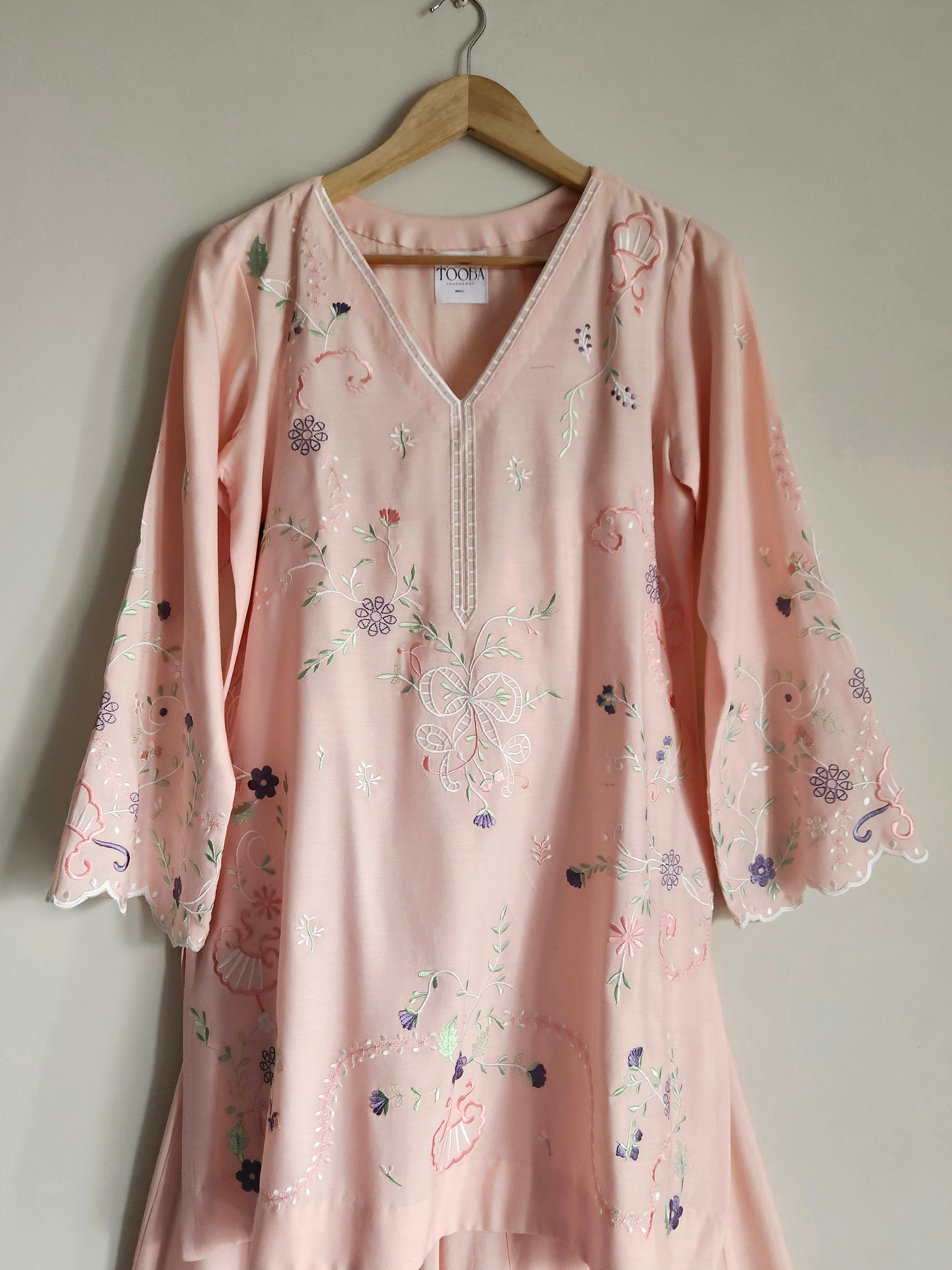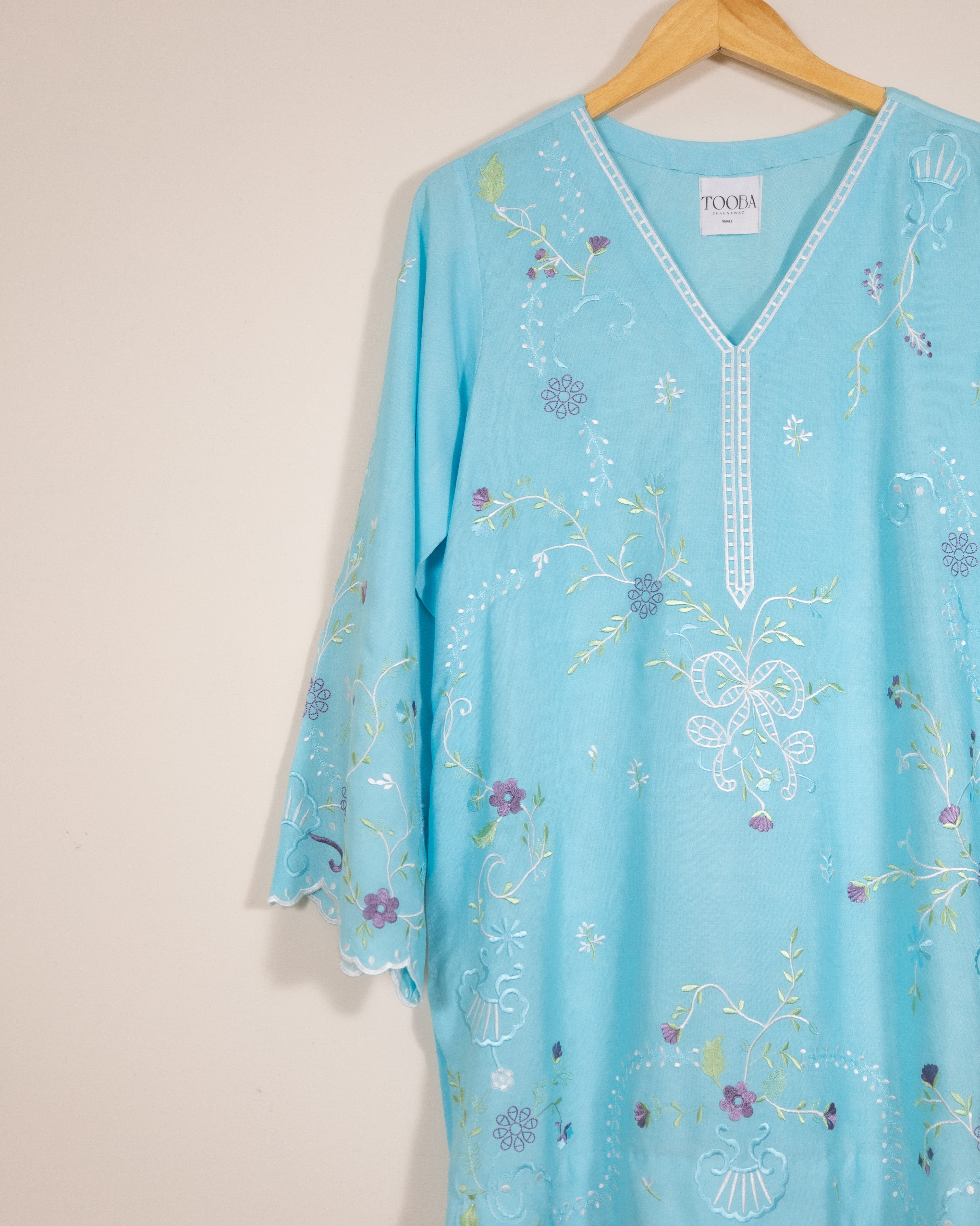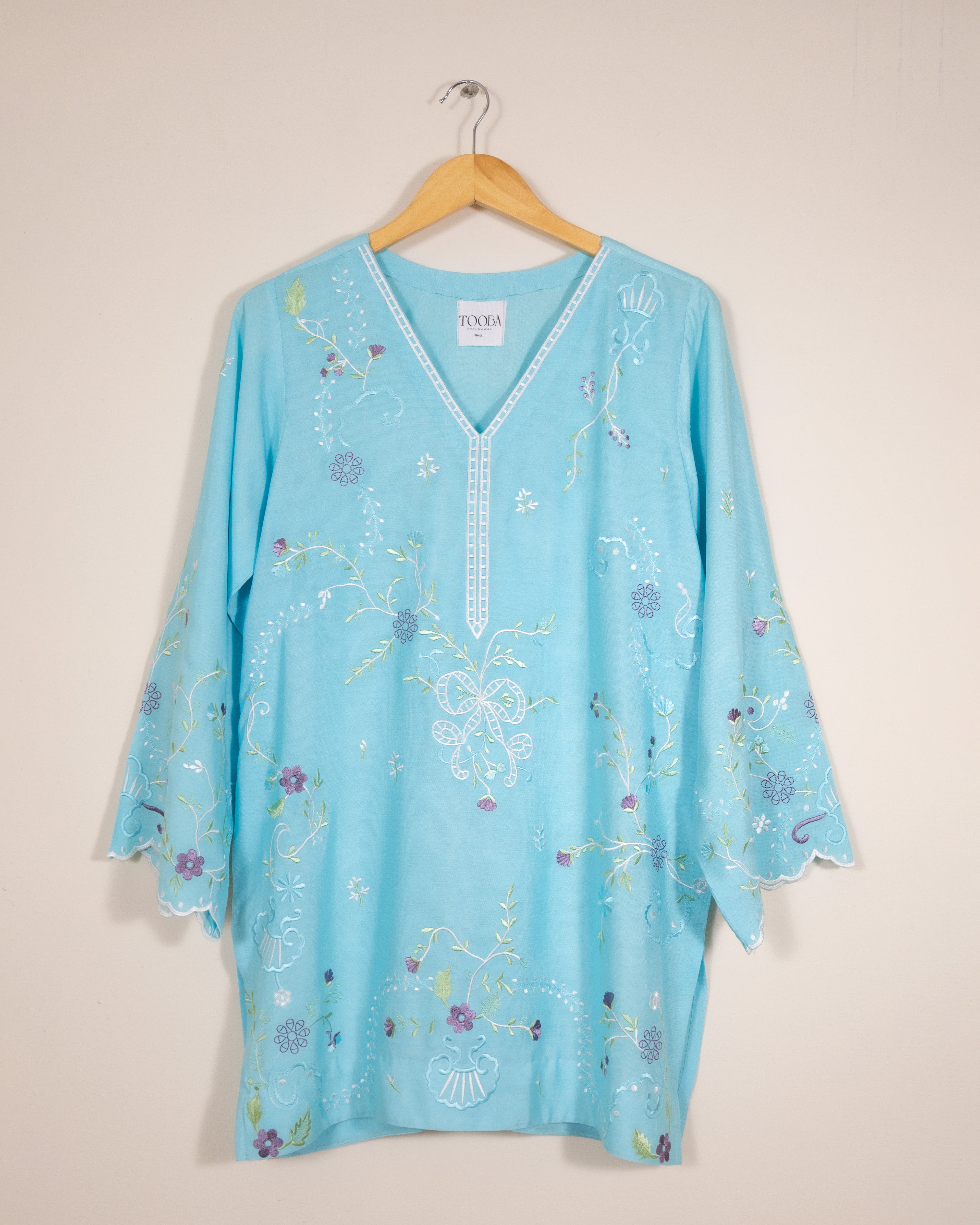 Laina is a wardrobe must-have—cut in breathable cotton-net and shown here with flared pants (though it pairs just as beautifully with a farshi shalwar).