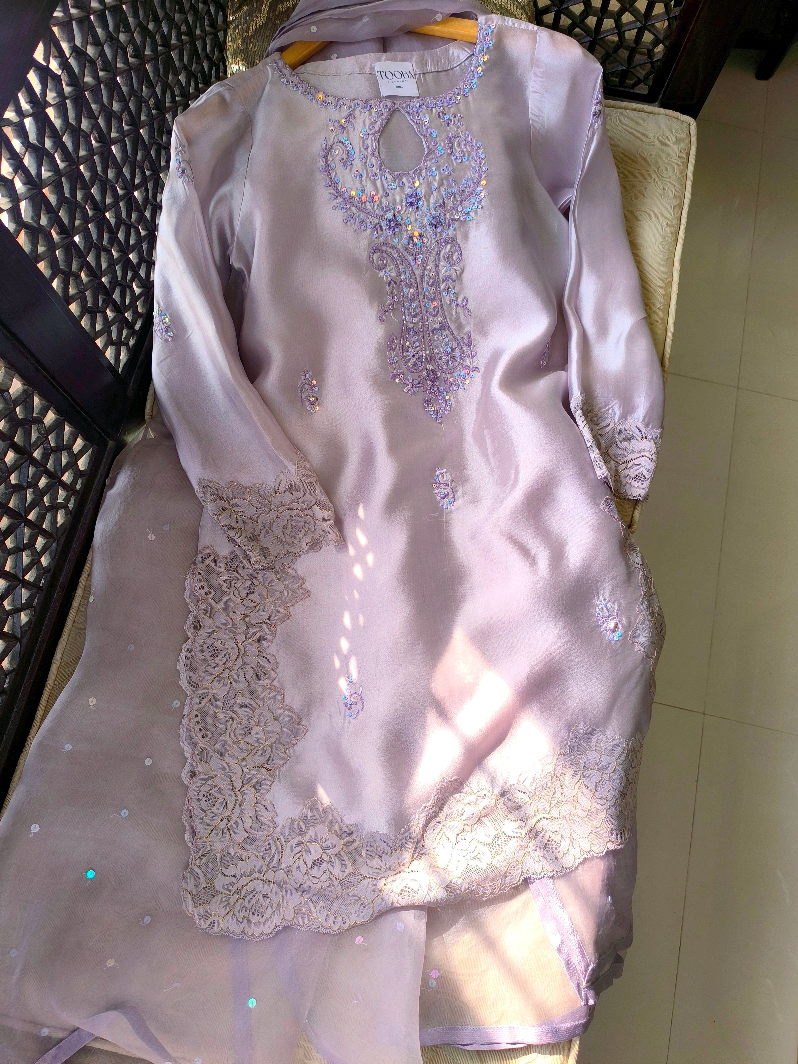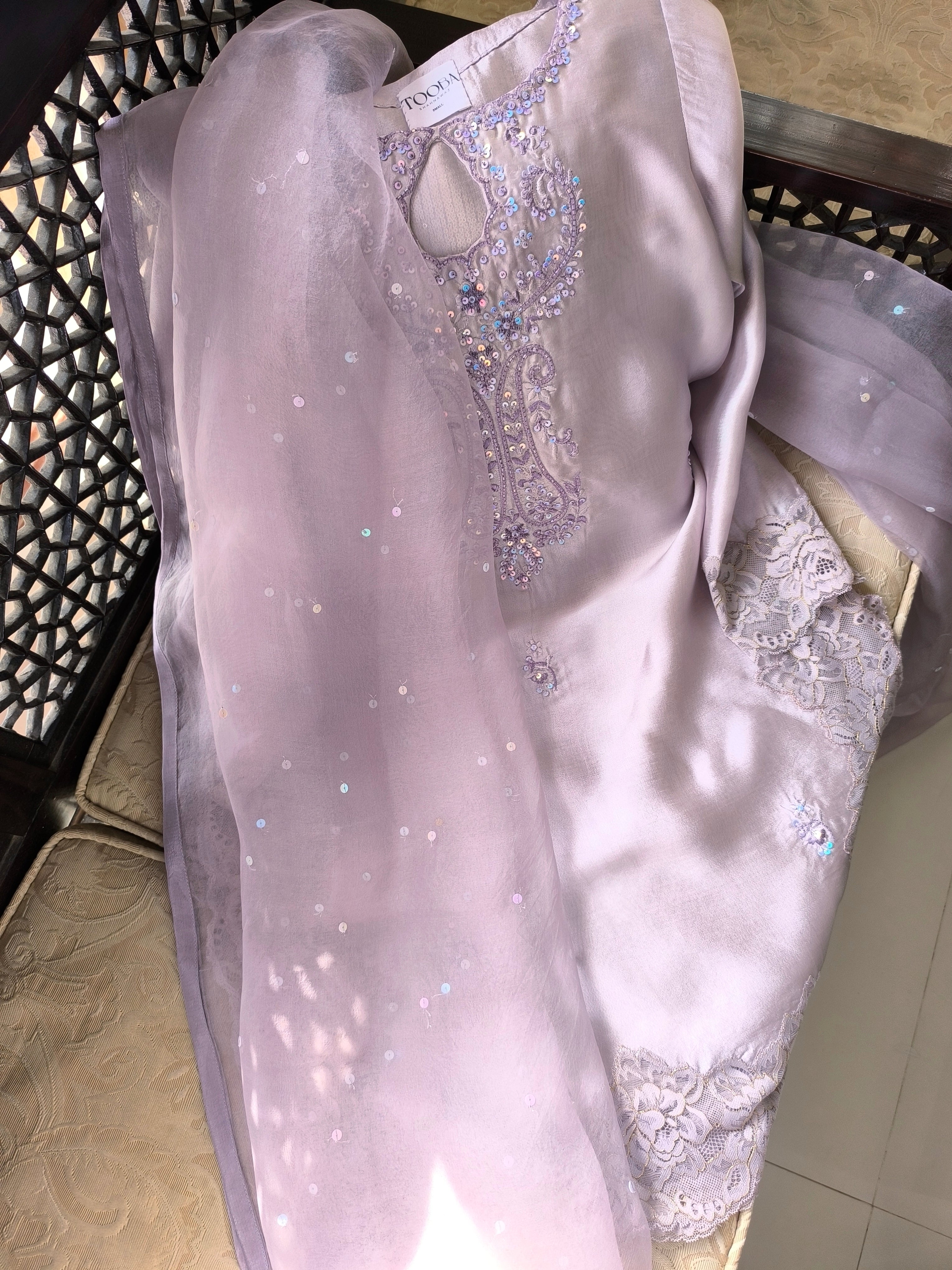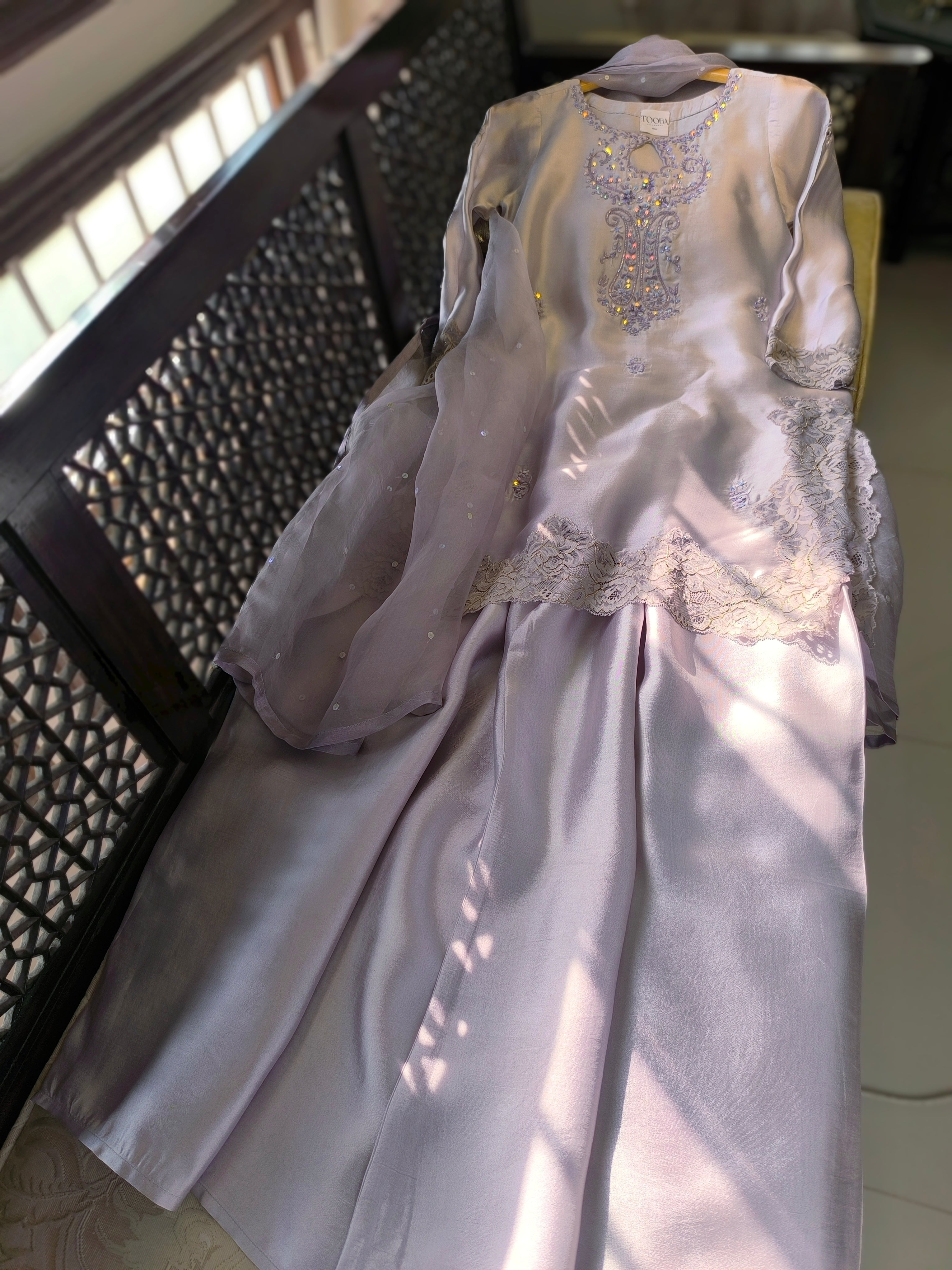 Crafted in pure sheesha silk, Naaz 2.0 comes in a muted mauve and is adorned with Chantilly appliqués along the front, back daaman, and sleeves. The neckline embroidery carries a traditional essence with a modern edge. The short shirt pairs effortlessly with flared pants, while the signature organza dupatta, sprinkled with sequins, ties the entire look together.